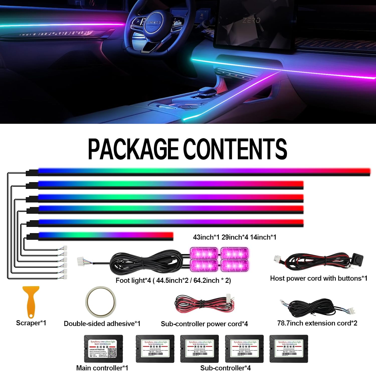 - ăRGBI Dreamcolor 10-in-1 Car Ambient Lightă This interior car LED light consists of 6 acrylic fiber optic light strips(175-inch 593 LED lights) and 4 under dash lights, and has one master controller and 4 slave controller, which can be flexibly installed in any car without clutter. The dreamcolor lighting effect of the upgraded RGBIC can bring you a different experience.