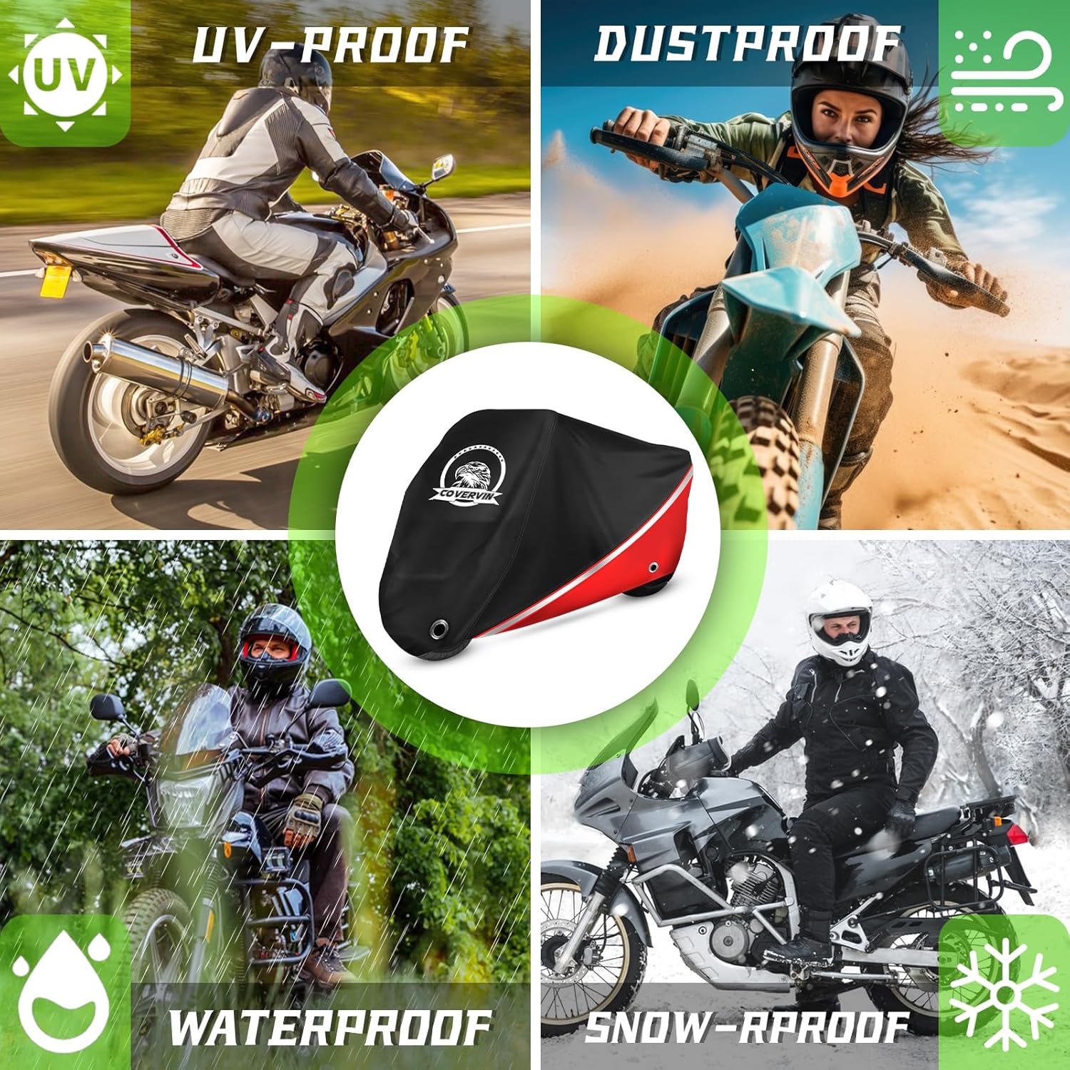 COVERVIN Motorcycle Cover, All Weather Outdoor Waterproof Night Protection with Reflective Strips, Locking Holes and Storage Bag for 96 Inch Suzuki, Kawasaki, Honda, Harley-Davidson(Red XL)