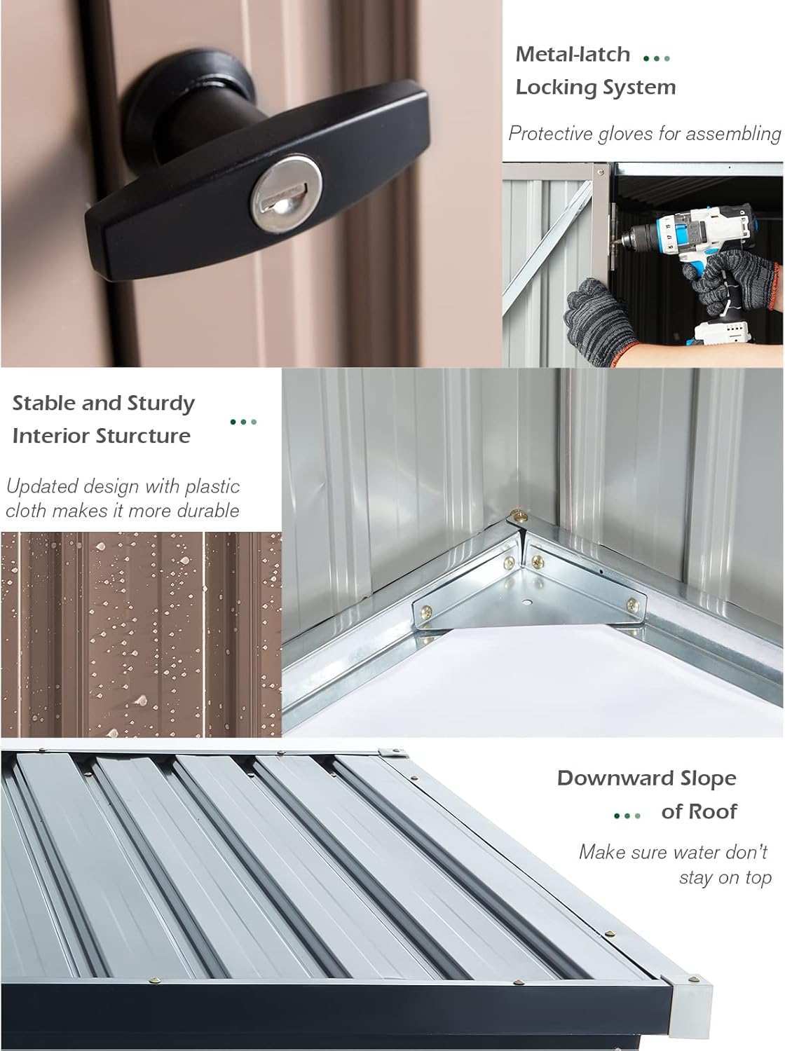 - 【AECOJOY Yard Storage Room】:Utility Shed with design of Durable structure, using panels of thickened galvanized steel for better reinforcement, functional tool shed under all kinds of weather conditions. Metal Locking system with keys makes it a safer shed for storage and tools keeping, Top quality lockable doors.