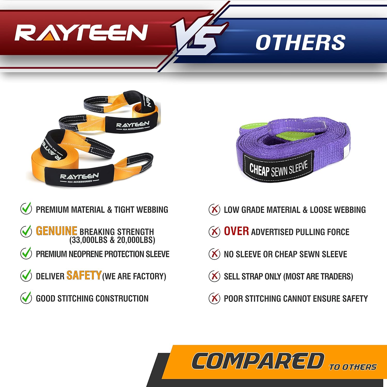- 【SUPERIOR MATERIAL】All RAYTEEN recovery tow ropes are manufactured by ALL-NEW premium polyester to ensure its performance and users’ safety while other brands use second hand material and over advertise up to 50% of its break strength.