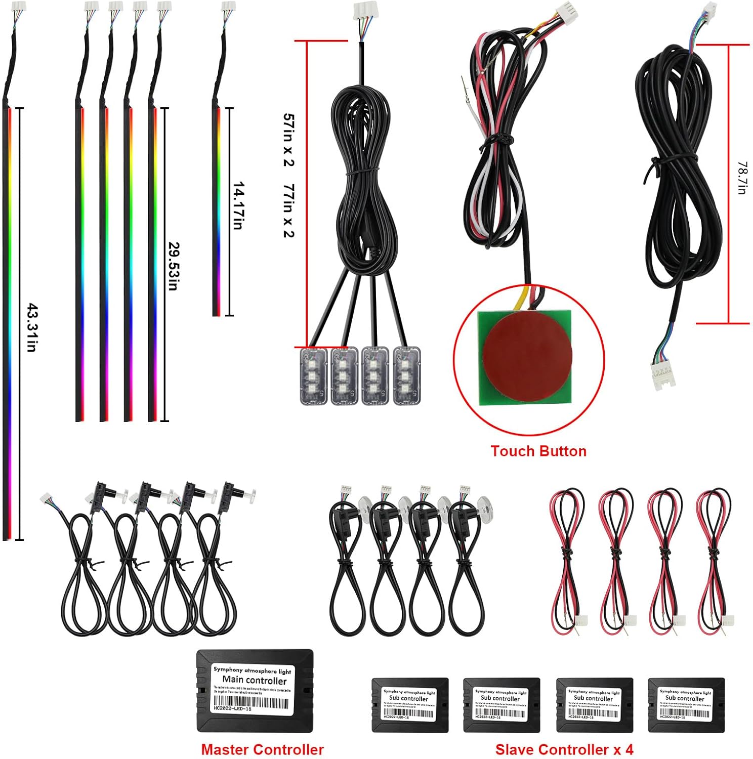 - Included Components : Acrylic fiber optic light X 6, Footlight X 4, Main controller module X 1, Sub controller module X 4, car door handle light X 4 Acrylic fiber optic light X 6, Footlight X 4, Main controller module X 1, Sub controller module X 4, car door handle light X 4