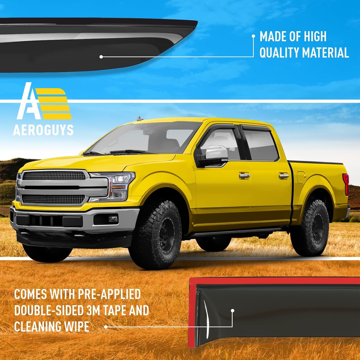 - No Tools Needed, Quick and Easy Assembly β These rain guards are very easy to fit. TAPE-ON INSTALLATION provides perfect fit for your truck. Just slip it onto your carβs window and your job is done within minutes. There is no drilling or no tools required. Be sure that AEROGUYS window deflectors are water resistant, sun protective and will not bend, break or crack regardless of the weather conditions.