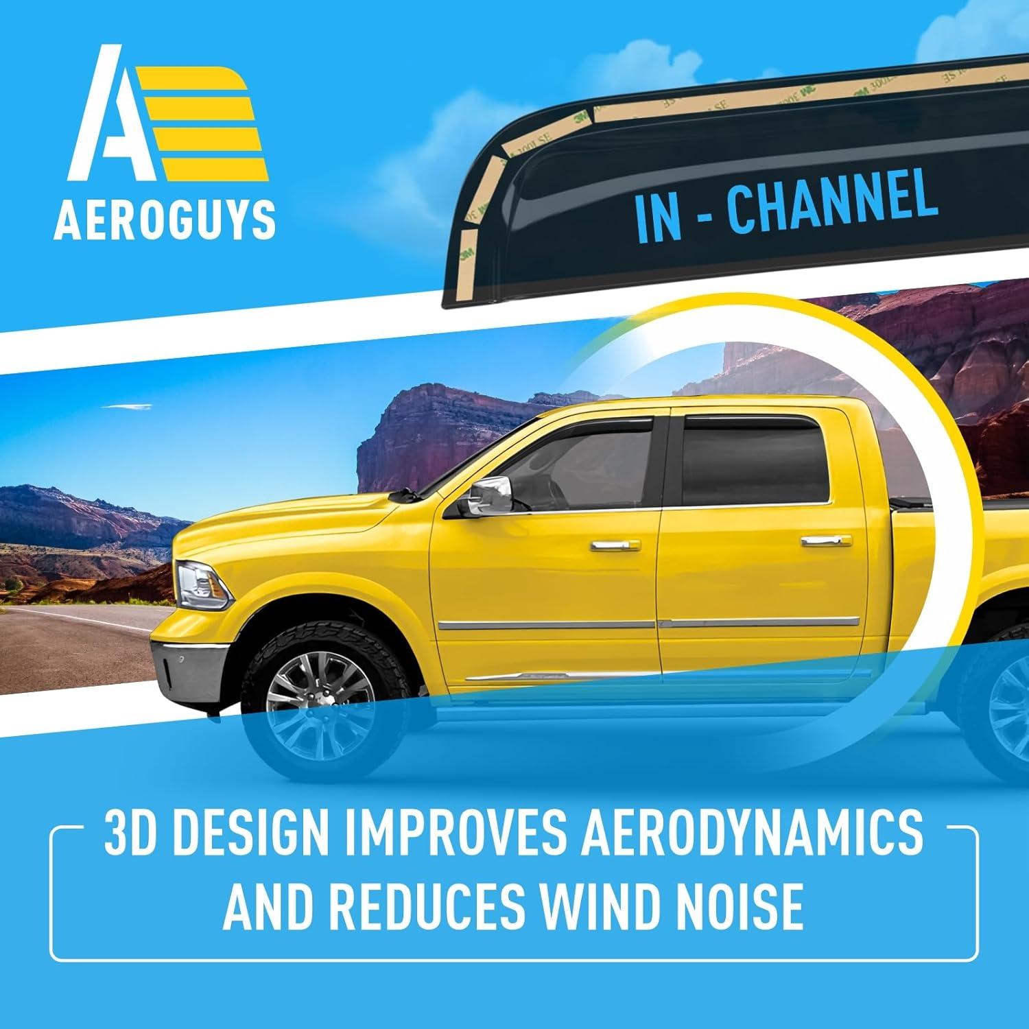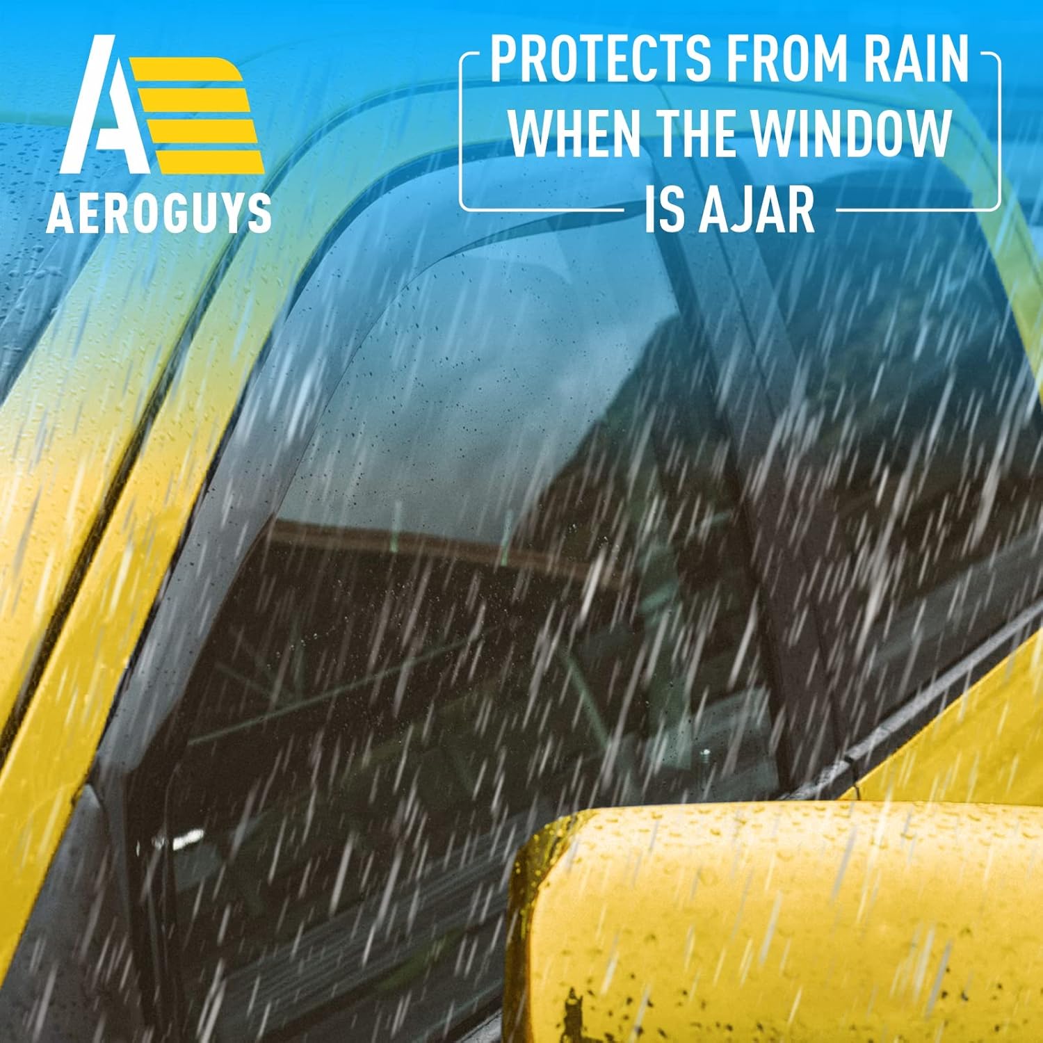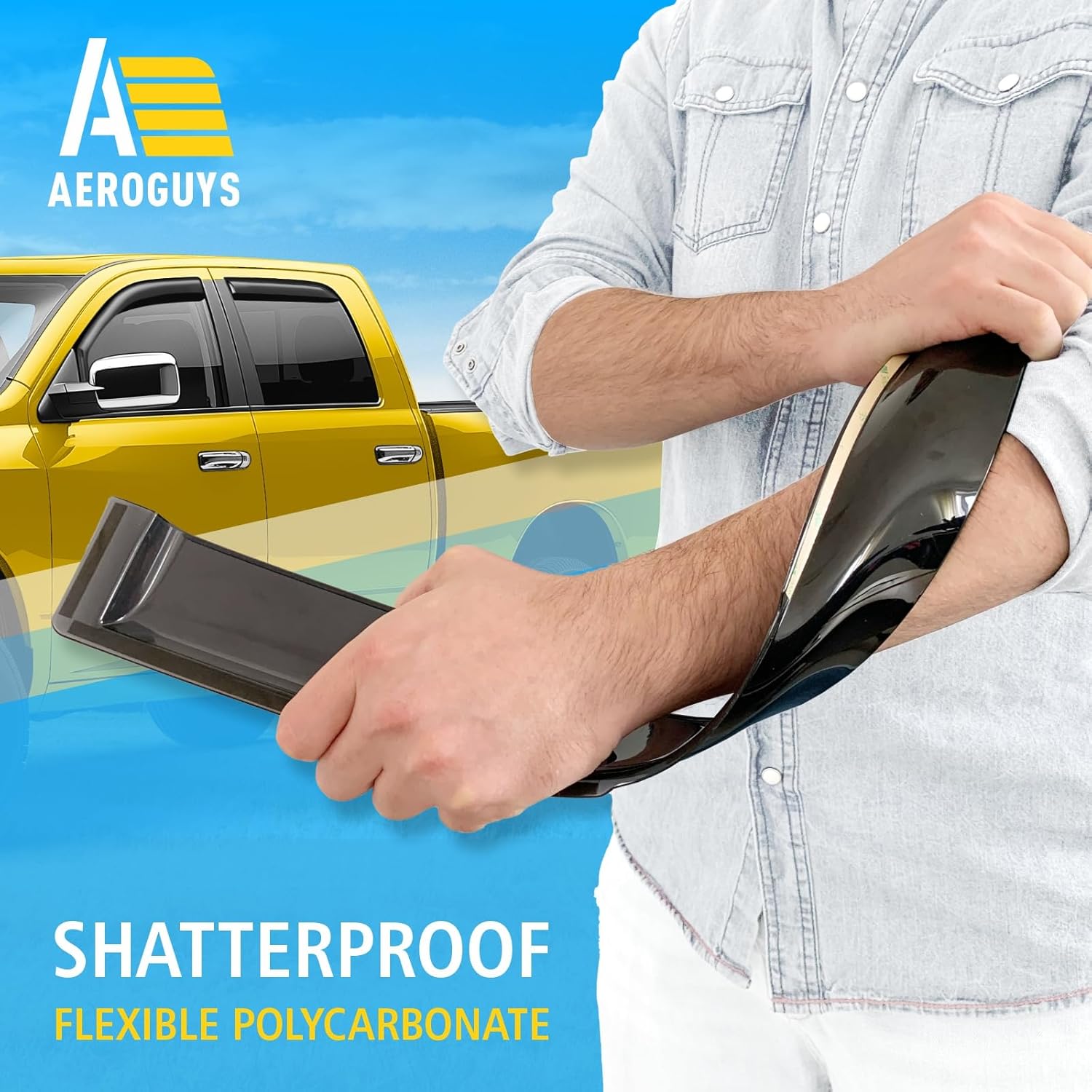 - No Tools Needed, Quick and Easy Assembly β These rain guards are very easy to fit. IN-CHANNEL INSTALLATION provides perfect fit for your truck. Just slip it onto your truckβs window and your job is done within minutes. There is no drilling or no tools required. Be sure that AEROGUYS window deflectors are water resistant, sun protective and will not bend, break or crack regardless of the weather conditions.