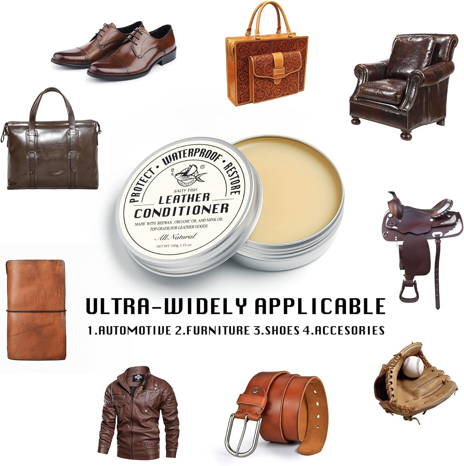 - ALL-NATURAL LEATHER CONDITIONER: SALTY FISH believes in the power of nature,this leather conditioner is made with a unique blend of food-grade all-natural ingredients, mink oil, beeswax, and plant oils in a unique ratio. Specially developed for leather products, it emits natural fragrance, non-toxic and long-lasting maintenance, non-greasy and residue-free.