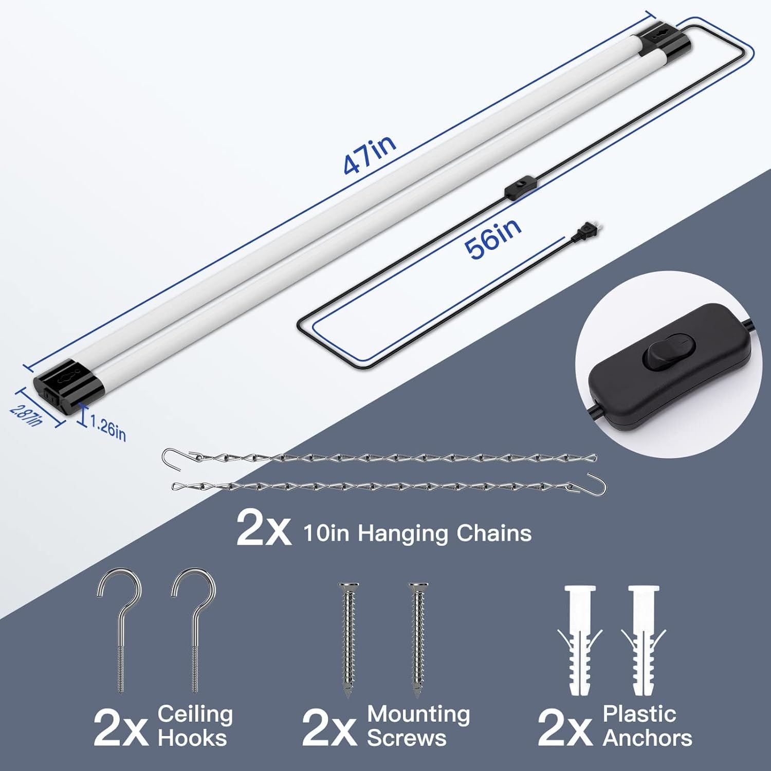 - Simple installation: Follow our installation guide for a quick and easy setup with included mounting hardware (56in Power Cord with PlugοΌ! Directly mount to the ceiling or suspend from the ceiling for instant bright shop light in your garages, basements, warehouses, and storage area.