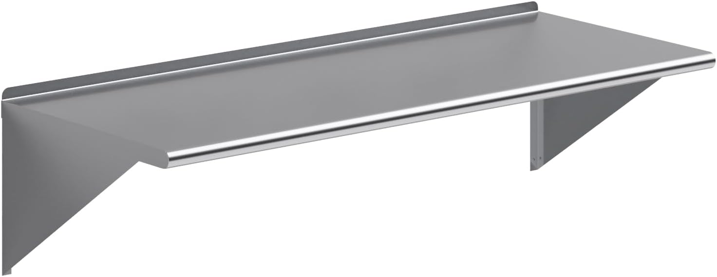 - 24 in. x 60 in. Stainless Steel Wall Shelf with 15 in. High Mounting Brackets. This heavy-duty multifunctional stainless wall shelf is made with 18 gauge stainless steel and can hold up to 450 Lbs of weight. The design features a 1 in. backsplash and bullnose edge. It's made with durable welded corners and support brackets.