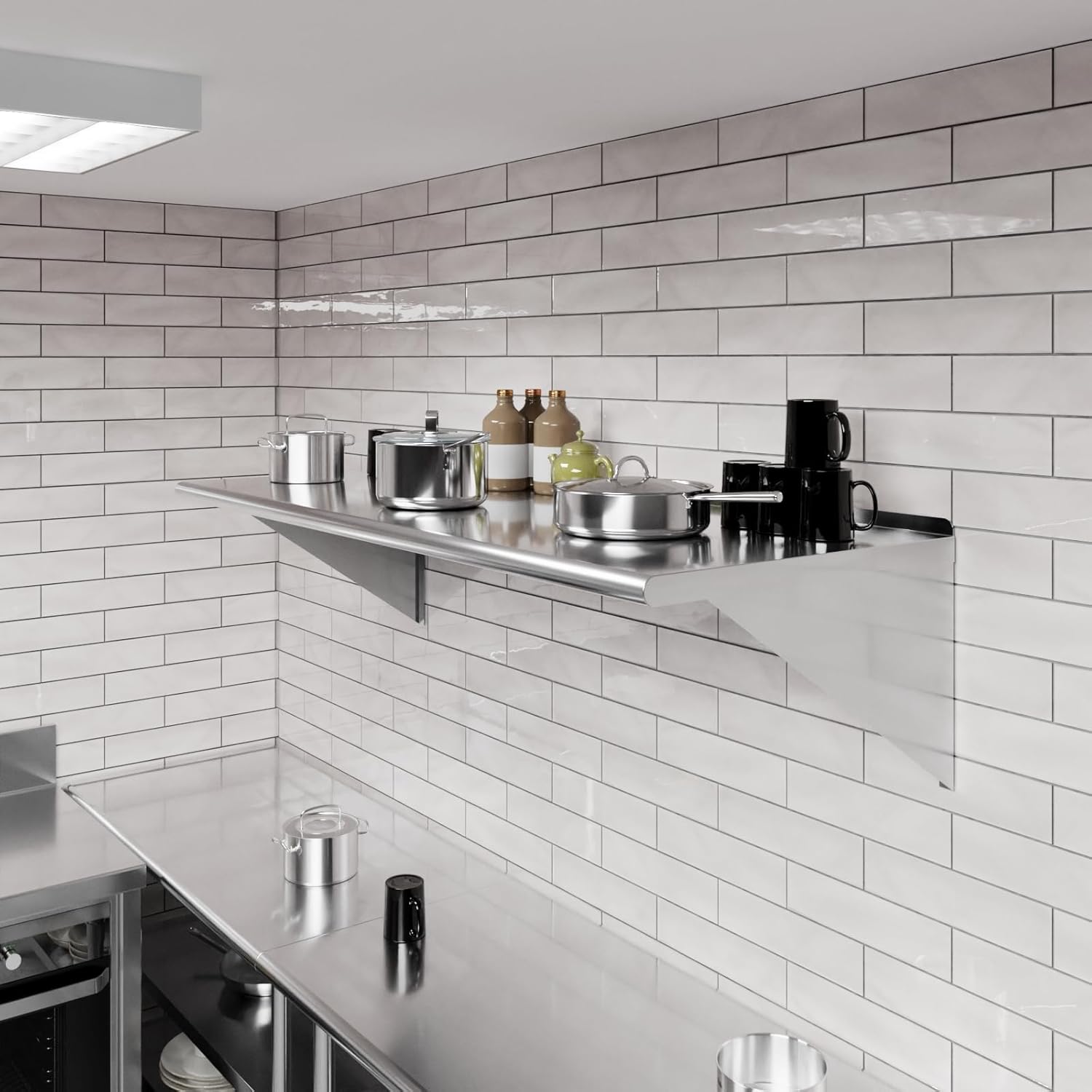- This corrosion-resistant wall mount shelf can handle anything you throw at it and will last for years to come. Easy to clean and sterilize, metal shelves are superior to wood or glass. Food and liquid wonβt get stuck or ruin the integrity of the surface. Easily wipe away excess with no fuss, mess, or contamination.
