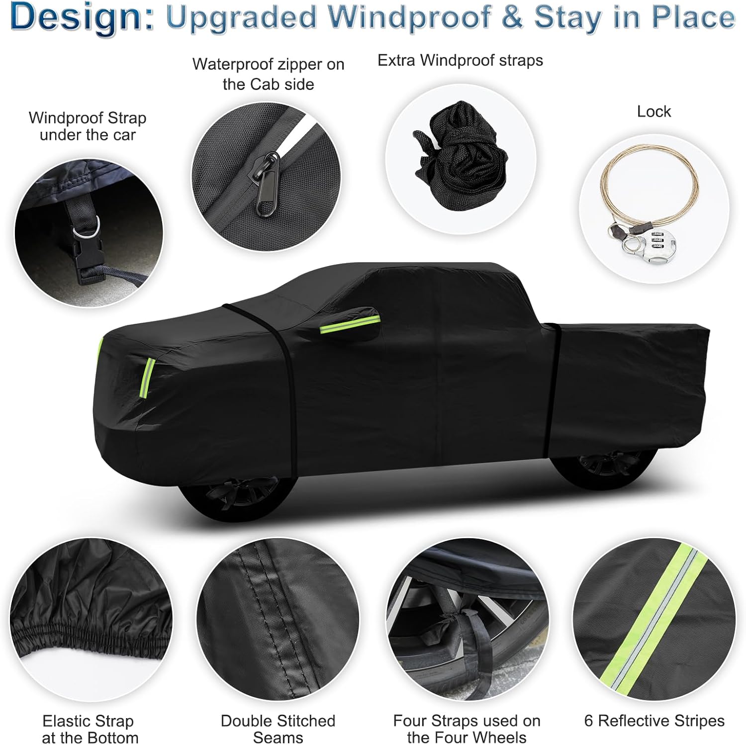 - 【Designs with Zipper】1) * A zipper on the cab side for convenience.2) pu Coating: UV protection and heat-proof,prevent cracking and aging of inner decoration leather and plastic. 3)5 Reflective Strips attached on the front DRL lamps, middle Turning lights and Rear taillight to prevent collisions during the night.4)It comes with four straps,a windproof buckle, a security lock and a storage bag.5)Mirror Pocket: protect rear view mirror in all directions.6)Double-stitched & Waterproof Strip.