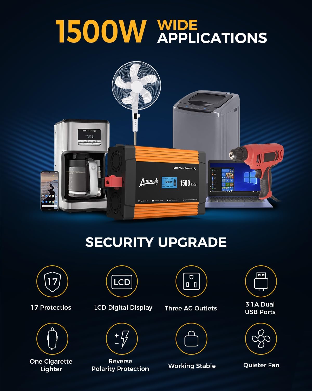 - 【Soft start and 16 Safety protections】At Ampeak, we take safety seriously, designed with an incredible 16 safety protections, With these protections in place, you can be confident that your Power inverter and devices will operate safely and reliably. This is a significant increase from the 4-5 protections found in most other power inverters on the market.