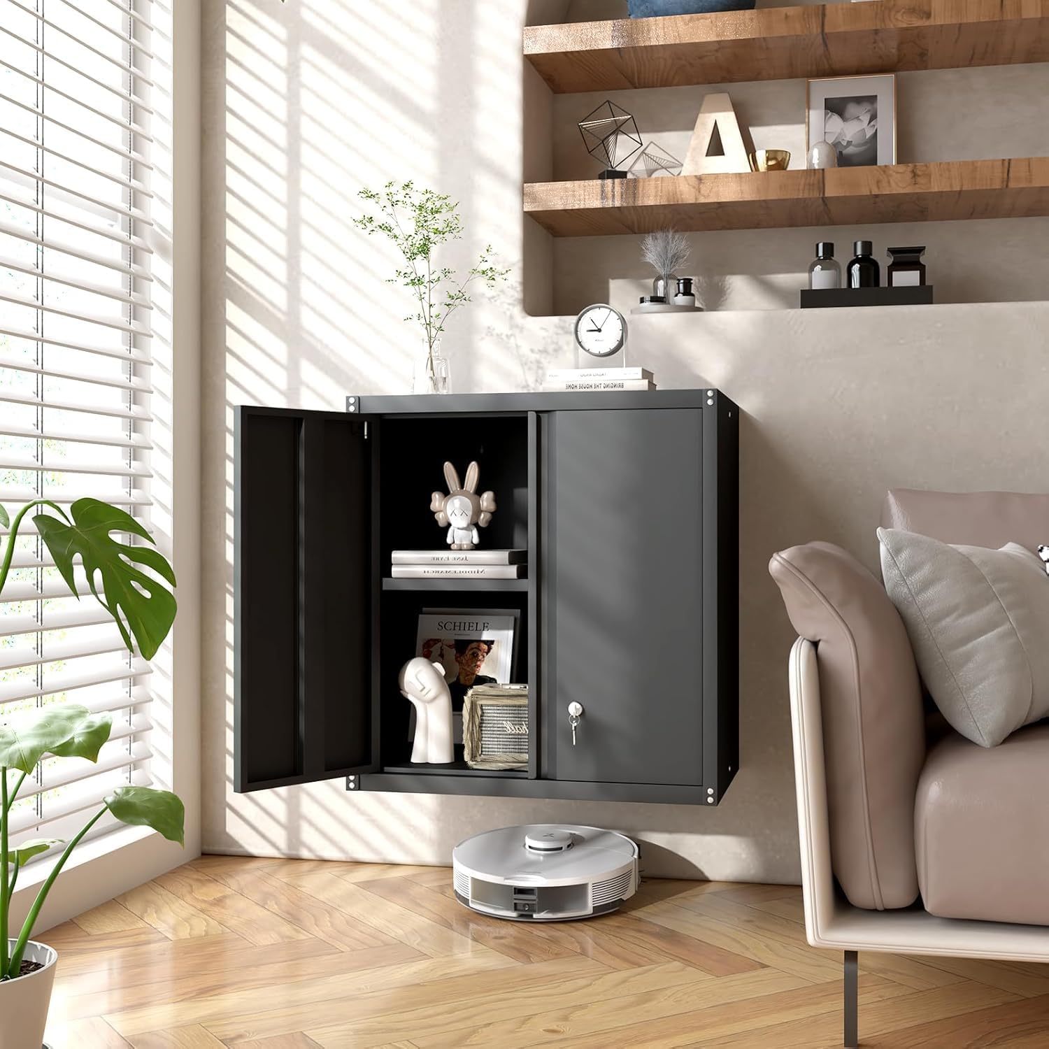 GREATMEET Locking Metal Wall Cabinets for Garage, Garage Cabinets Wall Mount, Steel Floating Hanging Storage Cabinet with Doors and Adjustable Shelf for Utility Room