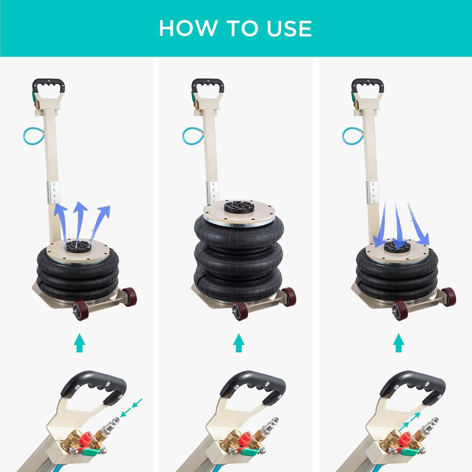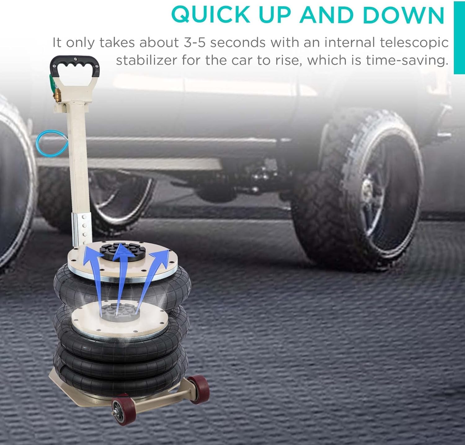 - Quick Up and Down : It only takes about 3-5 seconds with an internal telescopic stabilizer for the car to rise, which is time-saving. You can control how fast it inflates with the valve. The exhaust valve is throttled to make it deflated slowly and safely