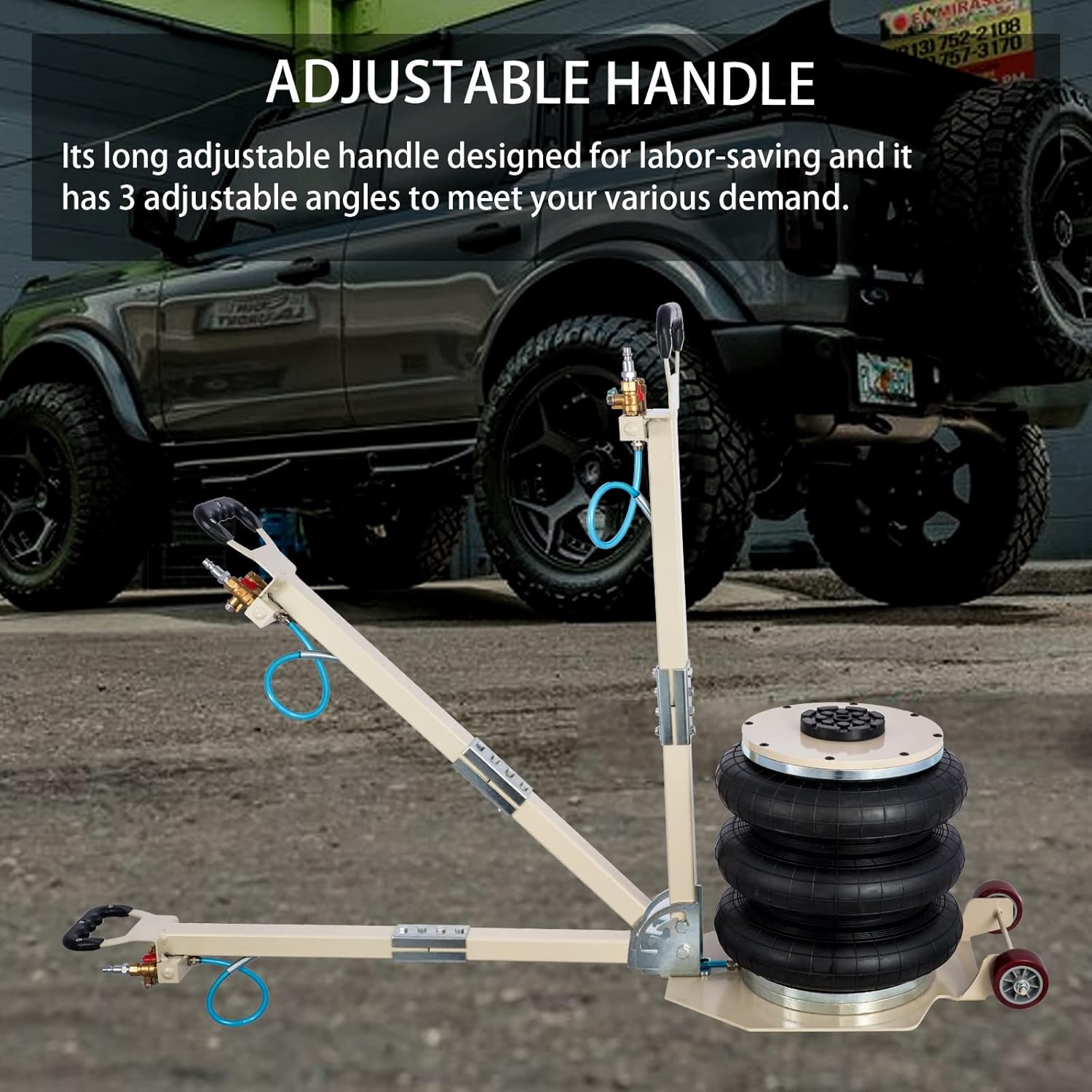 - Basic Specification :Type: 5T Adjustable Handle Air Jack. Weight Capacity : 11000 lbs (5 tons). Lifting height range : 5.5"-16.5" (14CM-42CM). Lifting time: 5sec. Working Temp: -60β~ 50βWorking pressure: 145Psi/10Bar/1.0Mpa. Air inlet: G1/4. Color: White