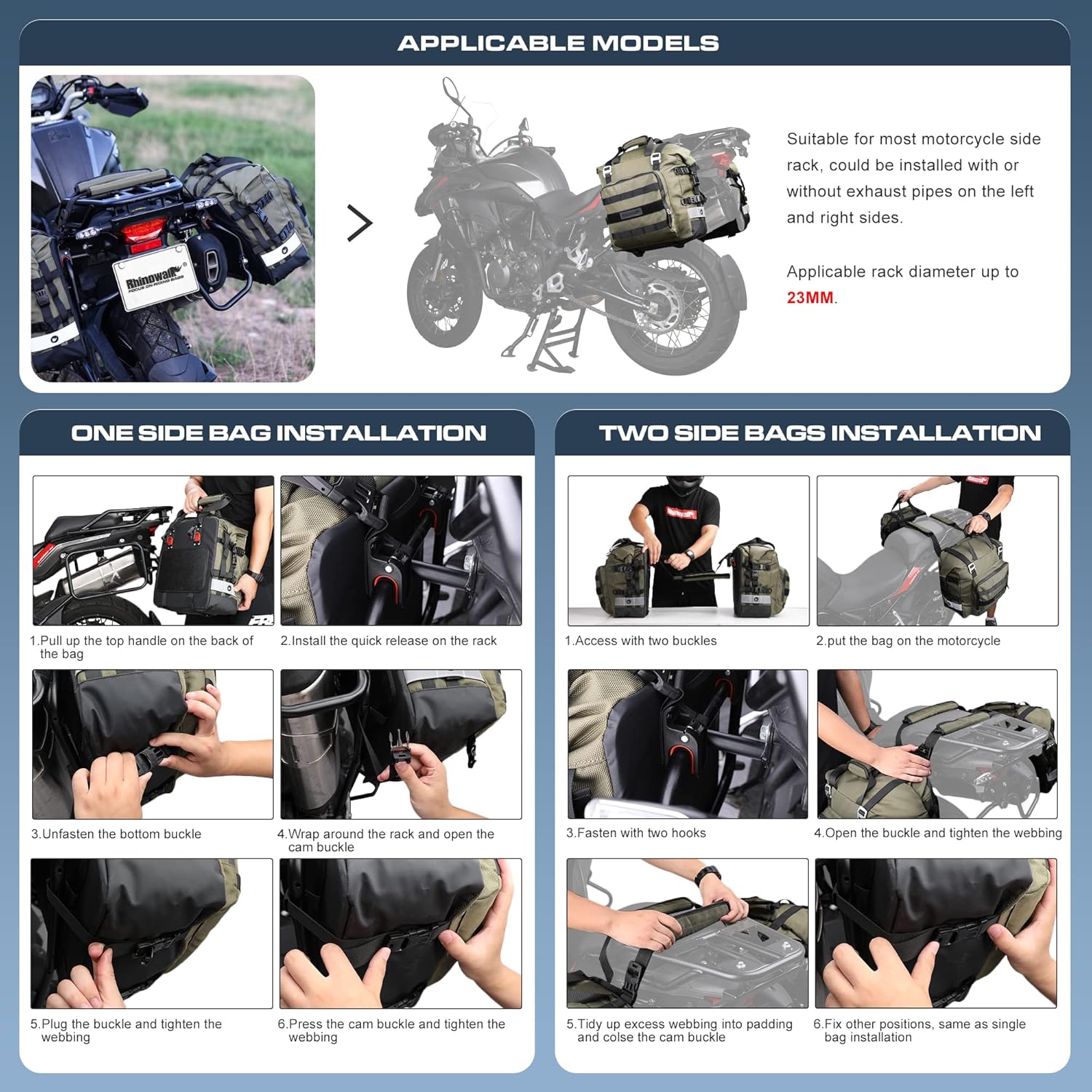 - Simple Installation: The back of the bag contains a quick release tool for quick installation. It is generally used in motorcycles on the market, and can be installed with or without an exhaust pipe. Suitable for side frames with a pipe diameter of 10mm-22mm. Equipped with a strap, it can be used as a shoulder bag, which can be crossed or carried by hand