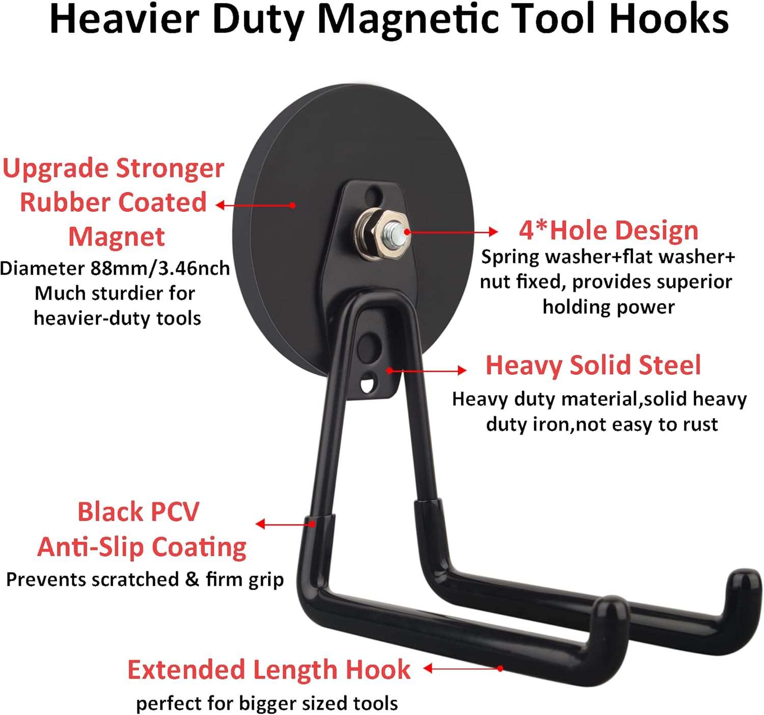 - [Heavy Duty Magnetic Hook]: Heavy duty solid steel hooks can create efficient storage space for your garden, shop, basement or warehouse. For example, to store drills, ladders, lawn mowers, garden tools, power tools, shovels, brooms, ropes, hoses, etc