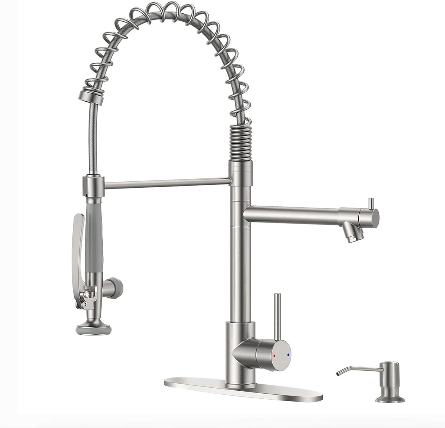 - ENJOY GREAT FUNCTIONALITY: With a one-function kitchen faucet sprayer and a separate pot filler spout, this pull out faucet allows you to handle all types of tasks. The spray head and stream spout can swivel around 360 degrees for full sink access, and the pre-rinse faucet ensures high pressure while still saving on water.