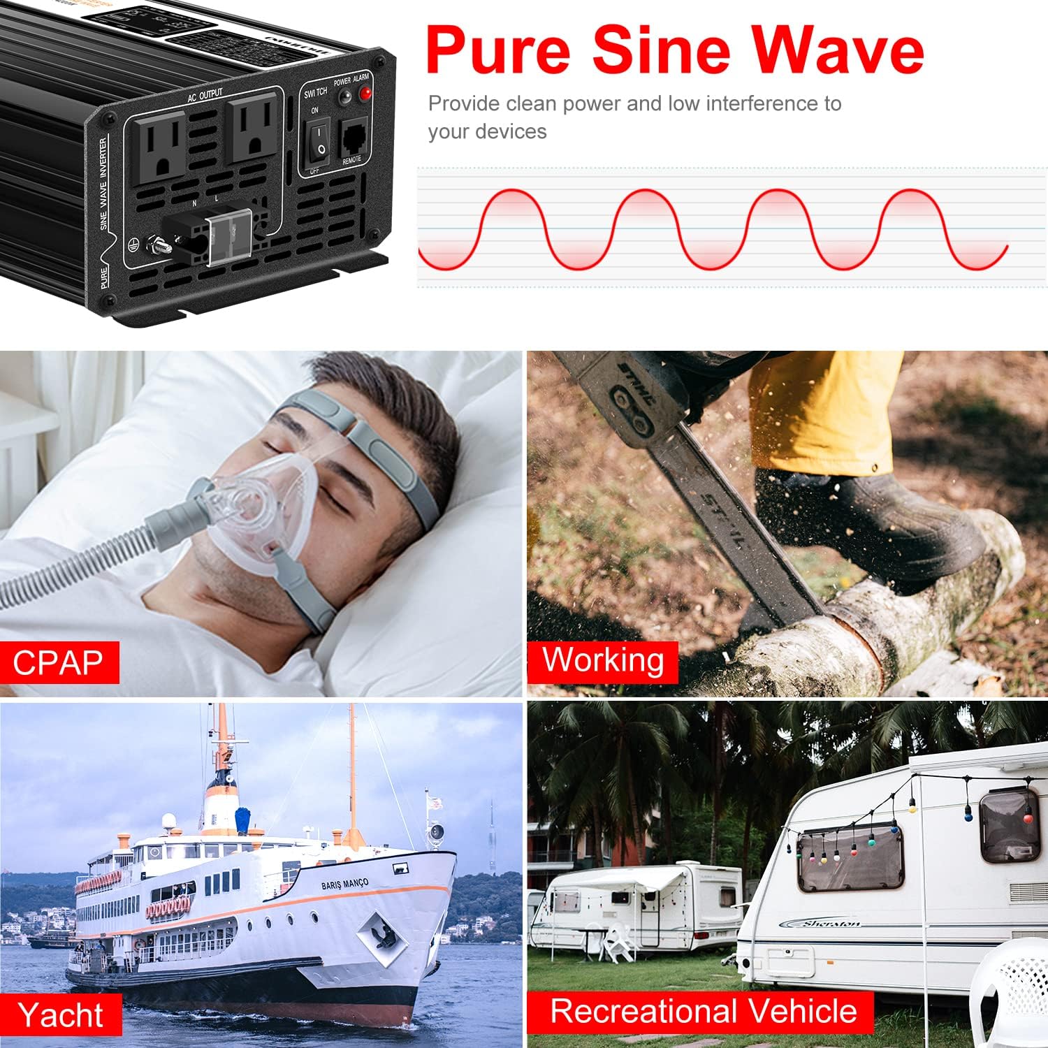 - 【Pure Sine Wave & Stable Output】Provides clean pure sine wave 2000W DC 48V to 120V AC continuous power. True pure sine wave inverter provides high quality and stable output power, Less wear to protect your AC equipment more stable.It's recommended by most cordless tool manufacturer that a pure sine wave inverter is used to ensure long battery life.