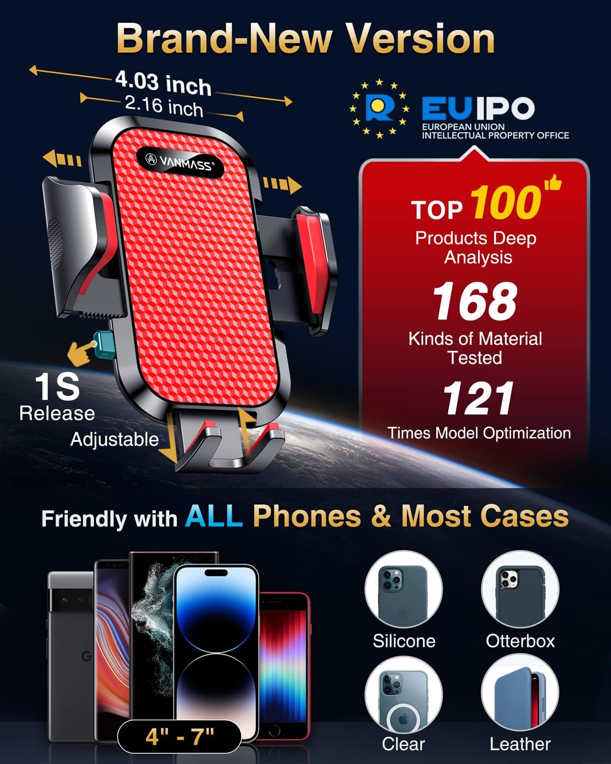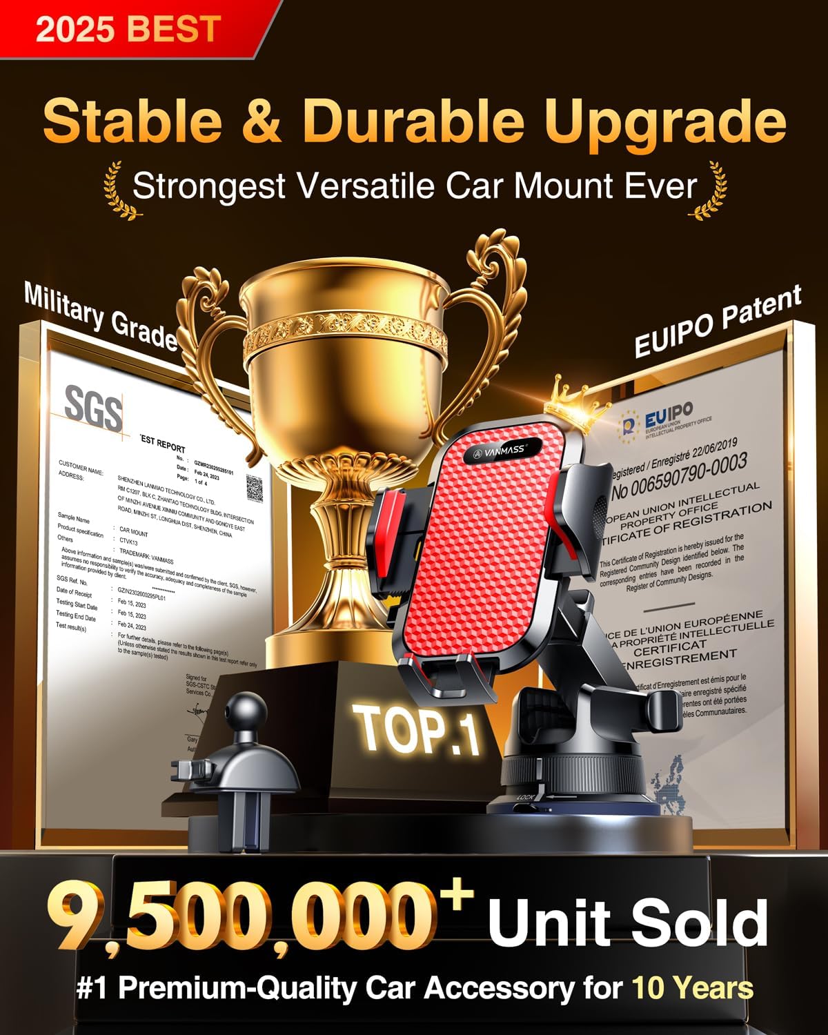 - 【Pro Version:VANMASS's Best Choice】VANMASS has been dedicated to car phone holder for 8 years, always leading the car holder industry in all aspects: safety, stability, durability, compatibility, multi-scene adaptability,climate friendly. The pro version mount enables the cutting-edge design team to create the best choice for customers- highest rating, most customers' preference, EU Intellectual Property Patent (No.007708805-0001), Military Grade Cert (No.GZMR220601855501), CP65/REACH/ROHS