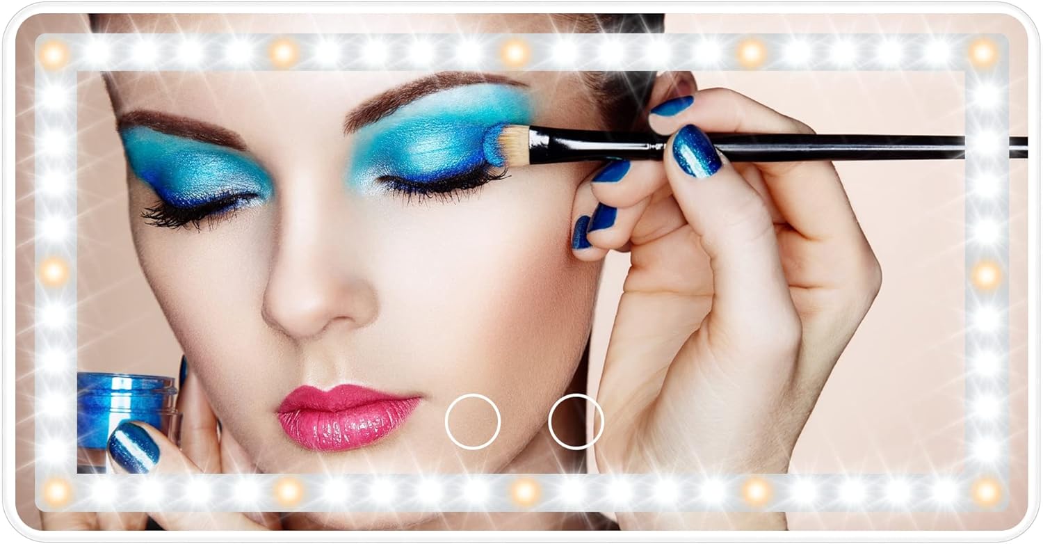 - 【SMART DOUBLE TOUCH CONTROL DESIGN】-There are two touch sensors, simply touch one of touch switches to turn on and off. You can switch the two colors of the lights(cool white, warm yellow). Long press to adjust the brightness of the lights. Memory function makes this mirror with lights return to the same brightness and color when you last using.