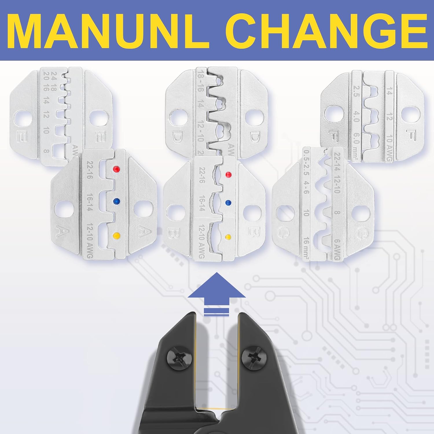 - Choose Without Barriers- Your equipment should never hold you back; When you need to change different wire connectors,the AWG-marked chrome-plated crimp dies offer you 6 options including heat shrink connectors,Insulated and nylon wire terminals,Non-insulated terminals,Insulated cable-end sleeves,open barrel terminals and solar connectors.Easy to operate, no confusion!