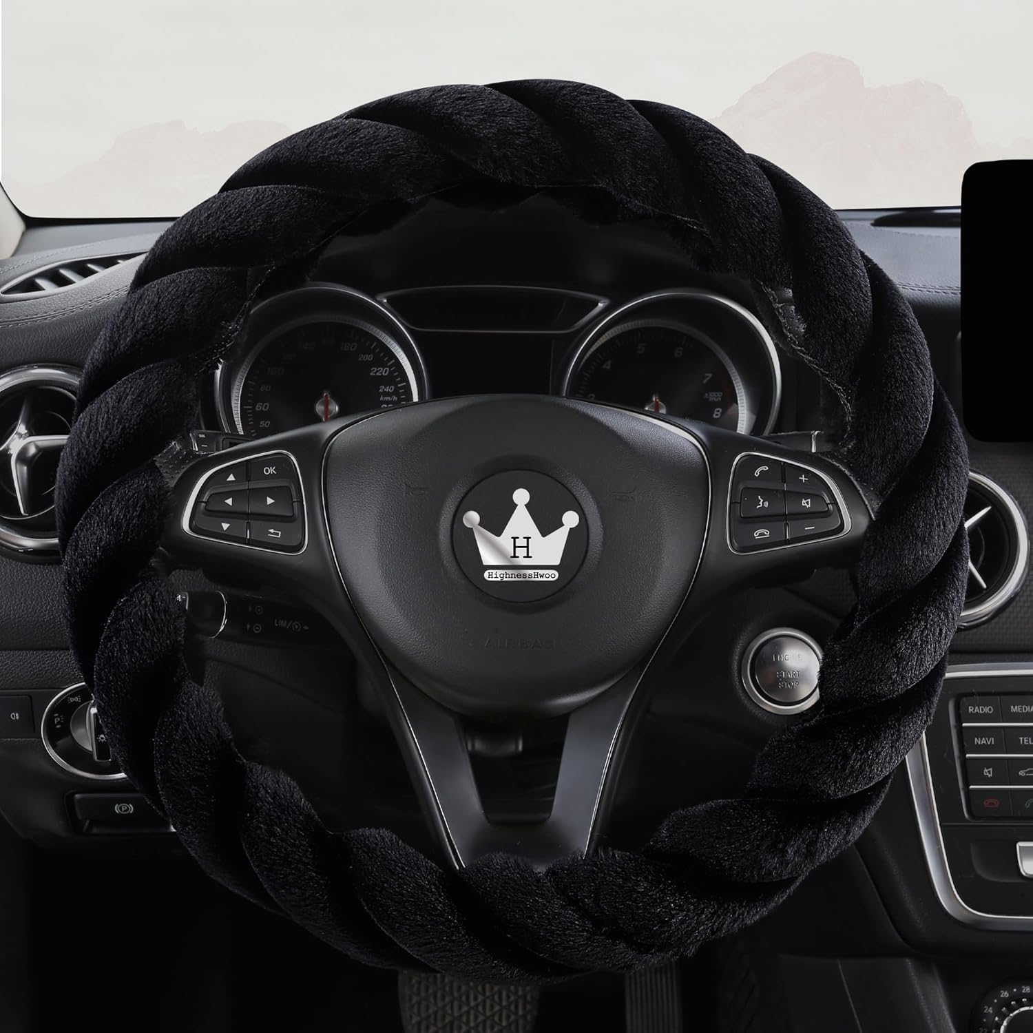 Luxury Fluffy Winter Car Steering Wheel Cover for Women Soft Warm Plush Cute Auto Accessories for Vehicle, Sedan, Universal, Fuzzy, Anti Slip, Black, Standard Size, 14.75-15.15"