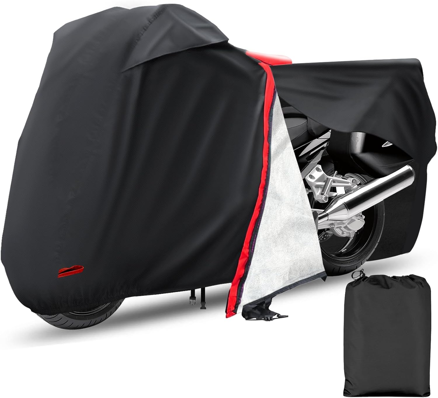 - [Internal Cotton] Our motorcycle covers use large fireproof cotton material near the exhaust pipe, so you do not need to worry about the high temperature of the exhaust pipe after parking will cause damage to the cover, which is a problem that other brands have not solved. At the same time, the internal cotton material also plays a role in protecting your motorcycle paint from scratching.