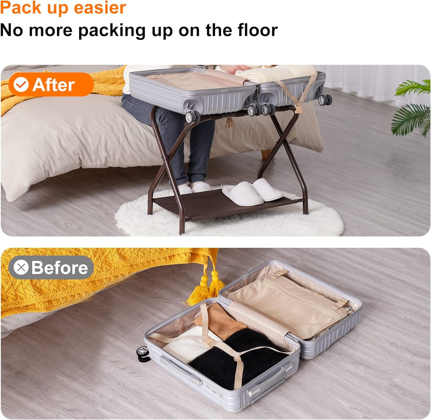 - Awesome addition for guest room: It was sturdy enough to hold a huge suitcase. Having the extra shelf allows storage for a tote bag or Shoes. The racks are very lightweight and fold up for easy, compact storage.