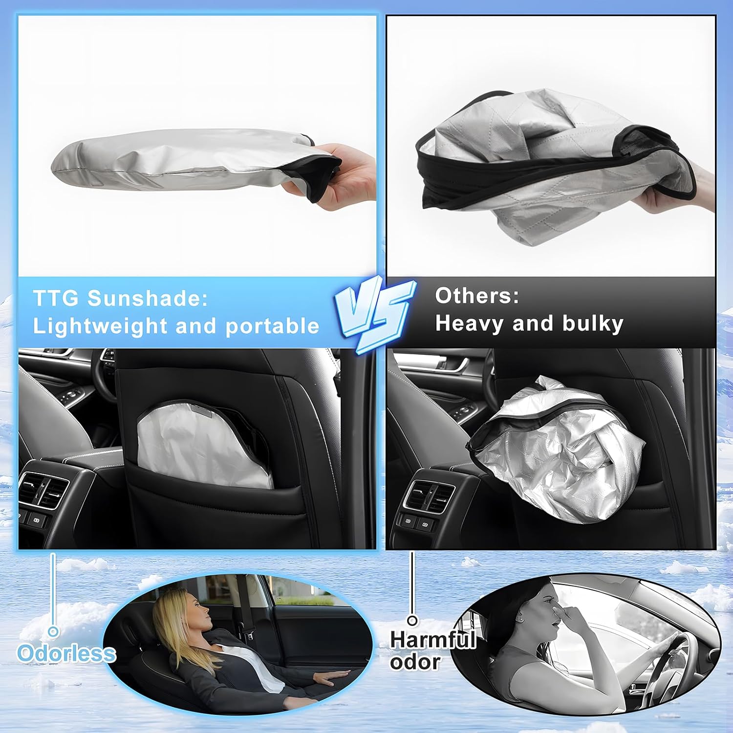 - 【New Upgrade Material】Abandoning traditional silver-coated fabric, T TGBROS sun blocker for car windshield adopted a 240T high-density base fabric combined with a polyester fiber high-temperature reflective cooling coating, newly Upgraded.