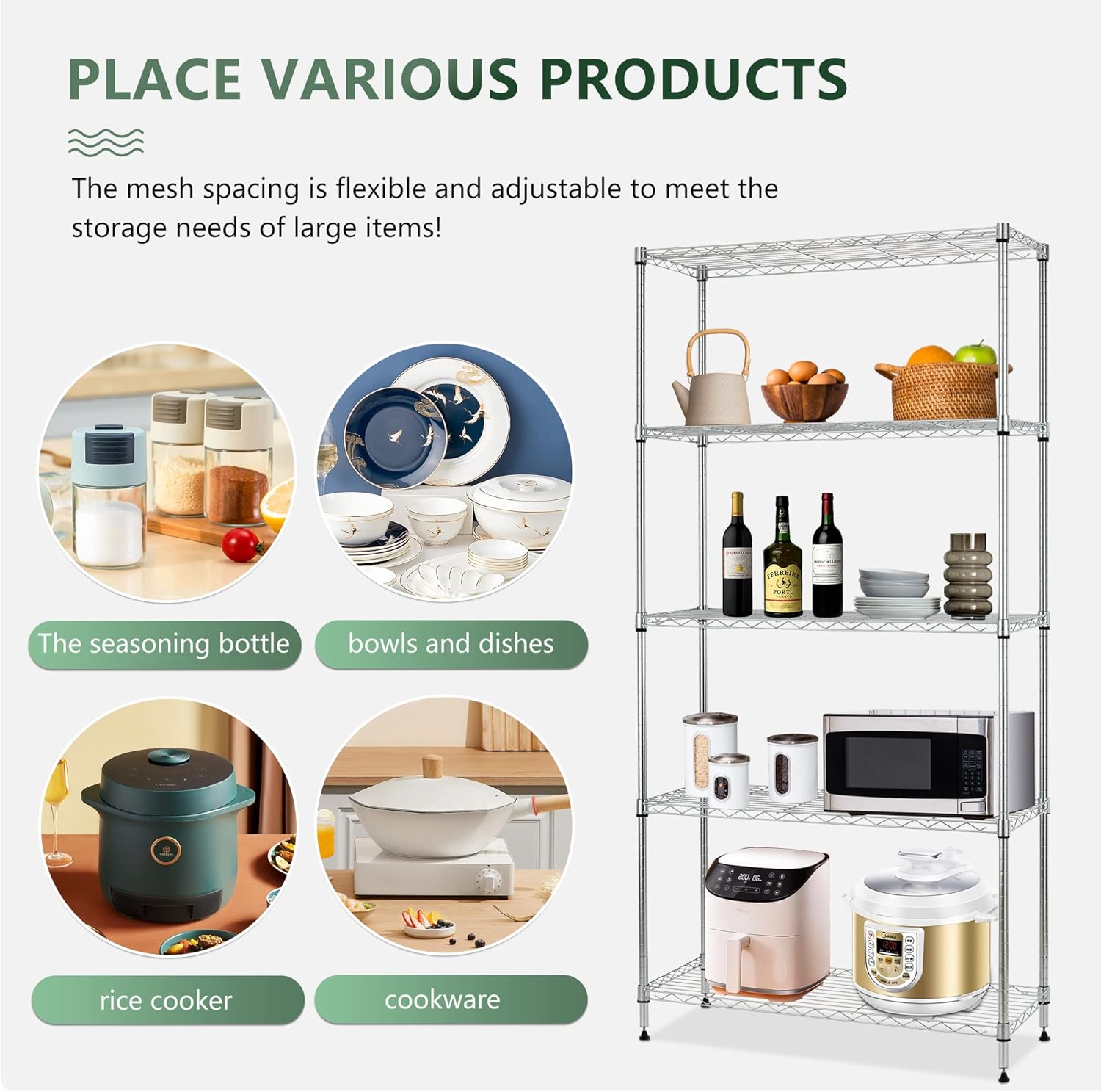 BestOffice 14Dx30Wx60H 5-Tier Wire Shelving Unit Steel Large Metal Shelf Organizer Garage Storage Heavy Duty NSF Height Adjustable Commercial Utility Storage Metal Rack on Wheels,Chrome