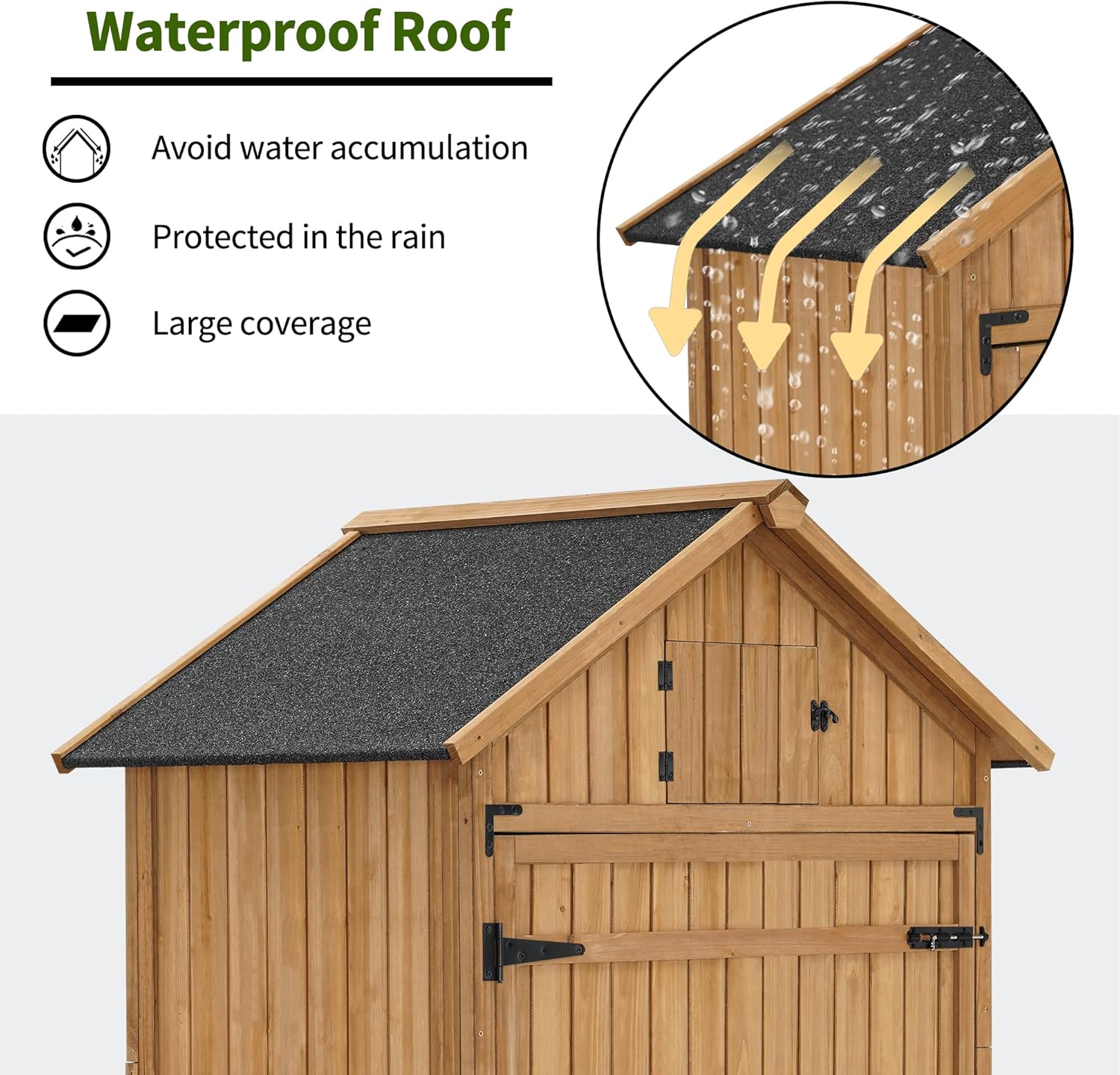 - Fir Wood Construction: Crafted from fir wood with a polished exterior, this storage shed showcases a natural, rustic style that blends seamlessly with any outdoor dΓ©cor; The medium brown finish enhances its aesthetic appeal while ensuring long-lasting durability