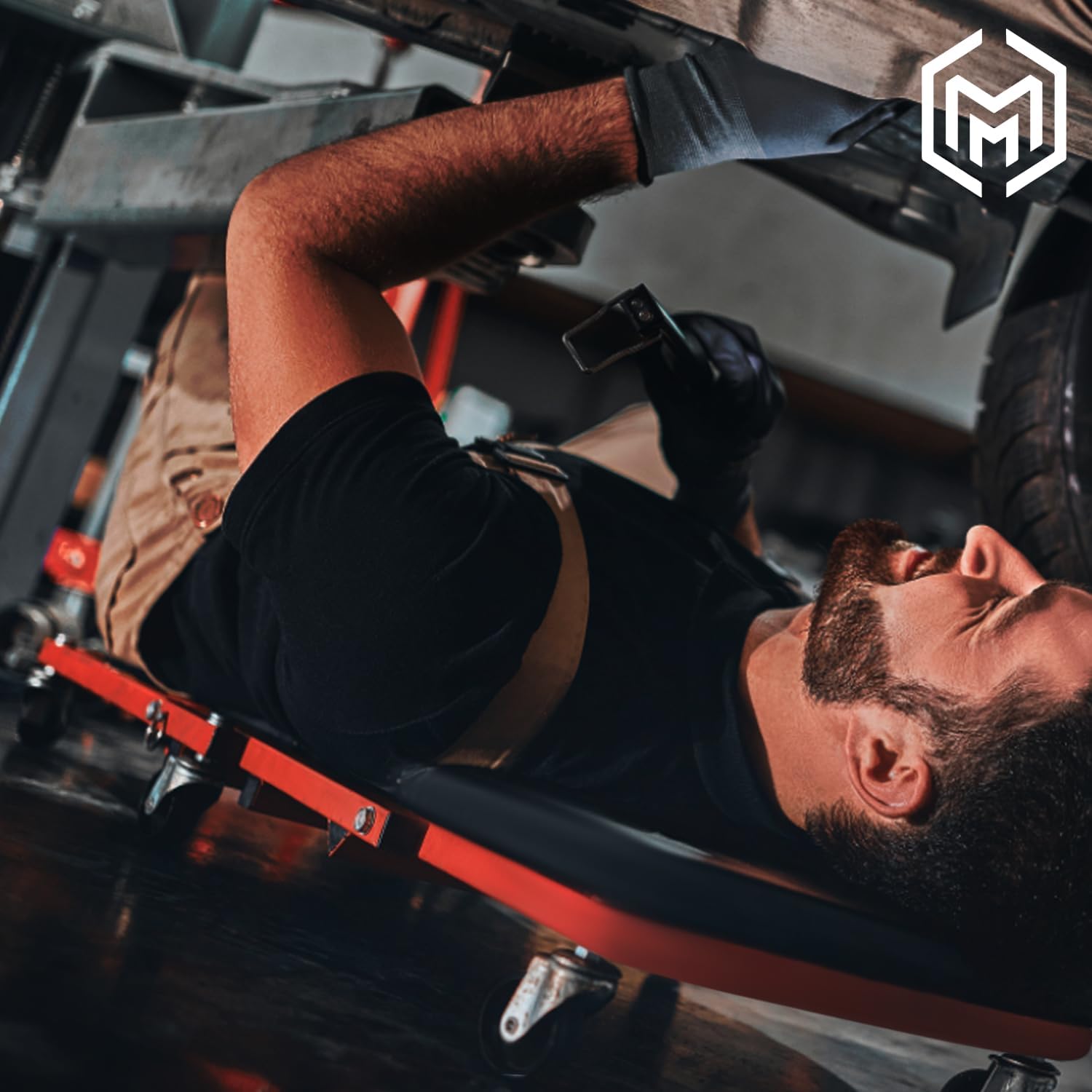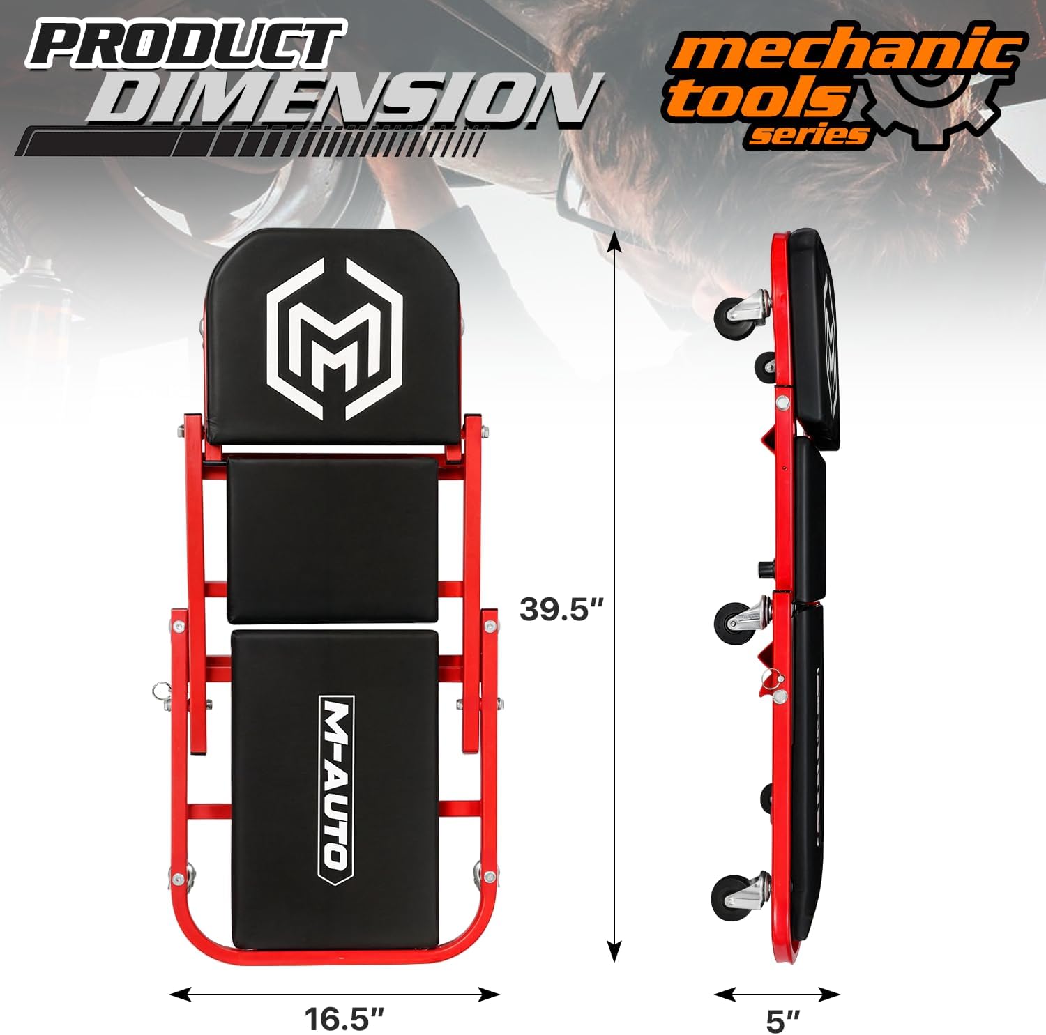M-AUTO 40-Inch Folding Creeper Rolling Seat, All-in-One Adjustable Roller Garage Chair, Lay Down or Sit, 330LBS Capacity Under Car Roller Creeper with 6 Swivel Casters, Red