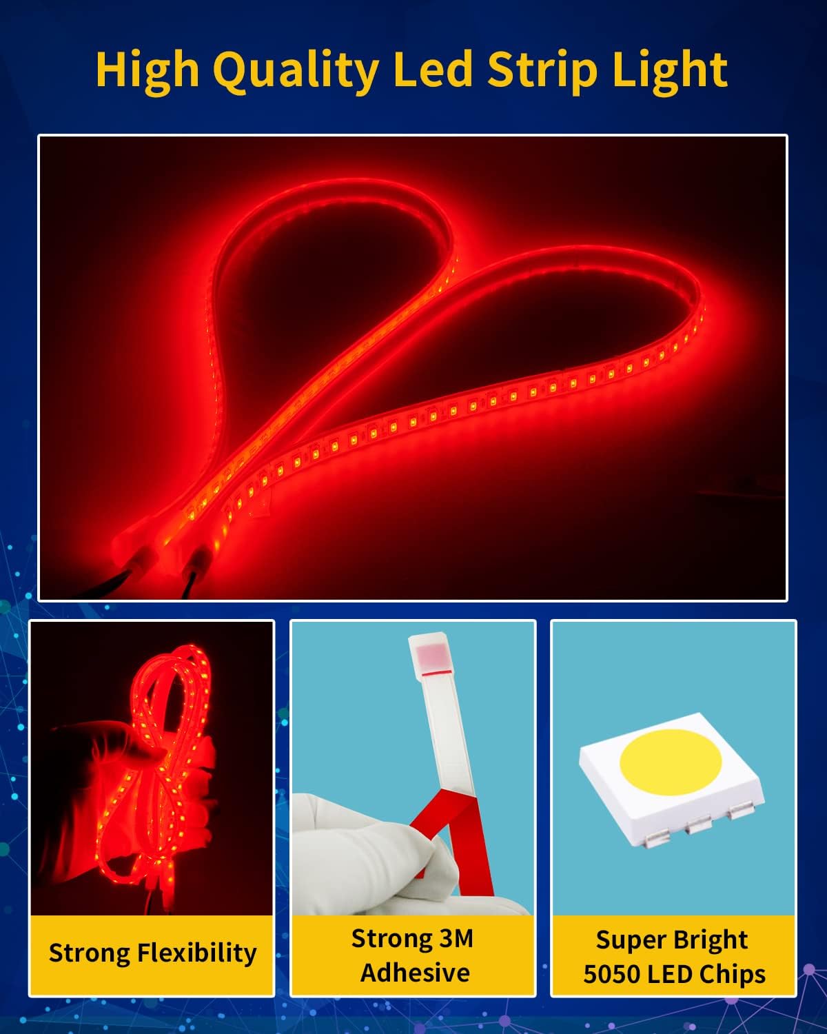 Red Car LED Strip Light,24inch 12V Interior Light Strip IP68 Waterproof Cuttable for Car Motorcycles Boat Golf Cart Truck Cargo Home Decoration with Strong Nano Tape(4PCS)