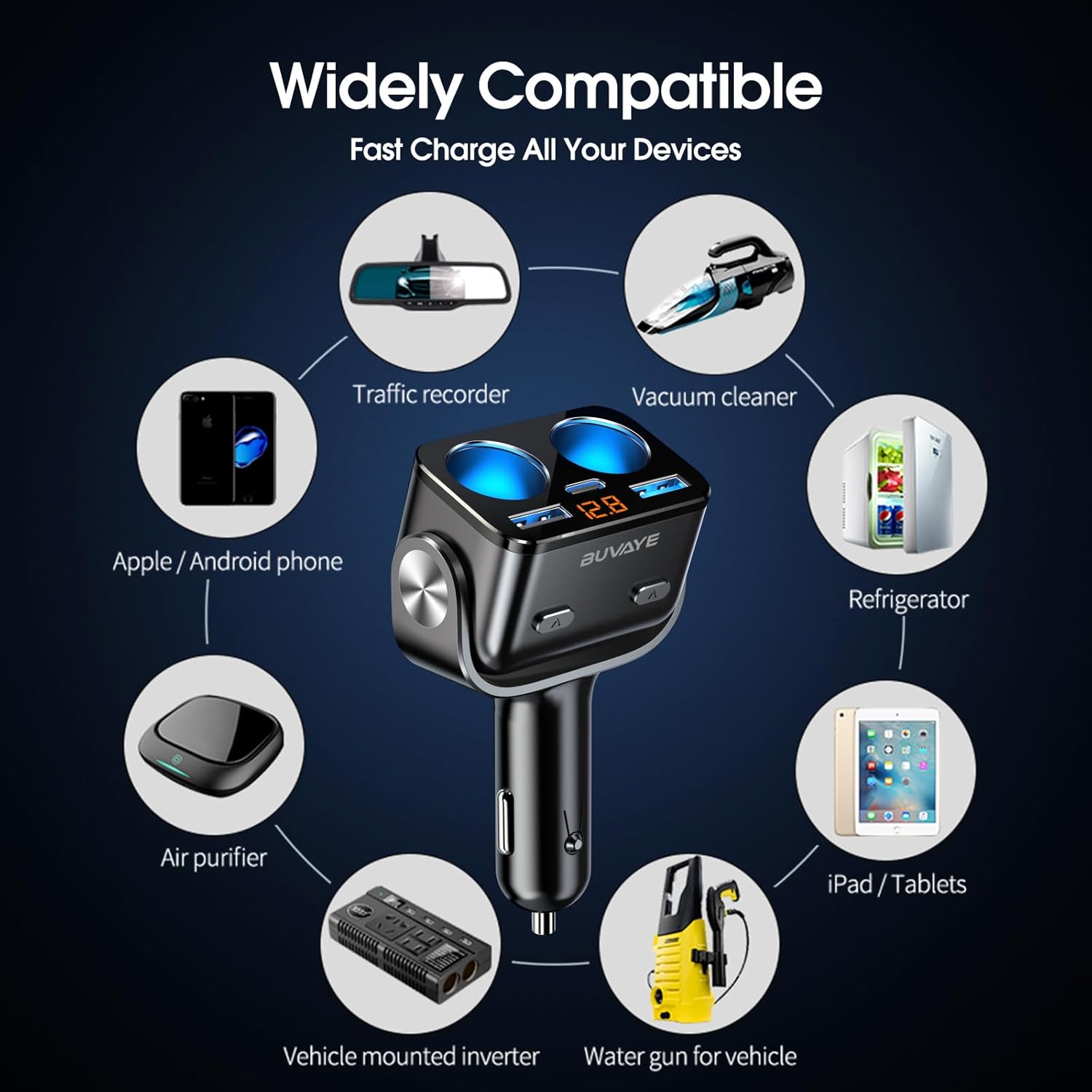 - 【Higher Output 】Dual cigarette lighter adapter with independent switches provide a total power of up to 155W, enough for simultaneous use of various watt automotive electronics, like Dash Cam, Radar Detector, GPS, Car Refrigerator, Heated Seat Cushion, Vacuum Cleaner and Aroma Diffuser.