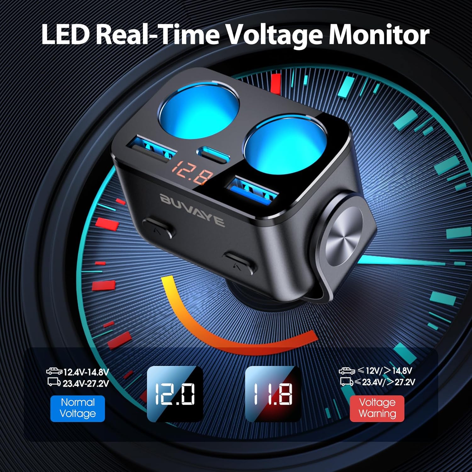 - 【Larger LED Display and Voltage Monitor】Large LED high-definition digital display screen monitors, can more accurately monitor 3 voltages in real time - 1x car battery voltage and 2 x USB-A charging voltage. Intelligent real-time voltage detection and LED screen display, timely monitoring of your car battery, to avoid the situation of running out of power and so on. 12V voltage normal range: 11.6V~14.8V; 24V voltage normal range: 23.1V~27.3V.