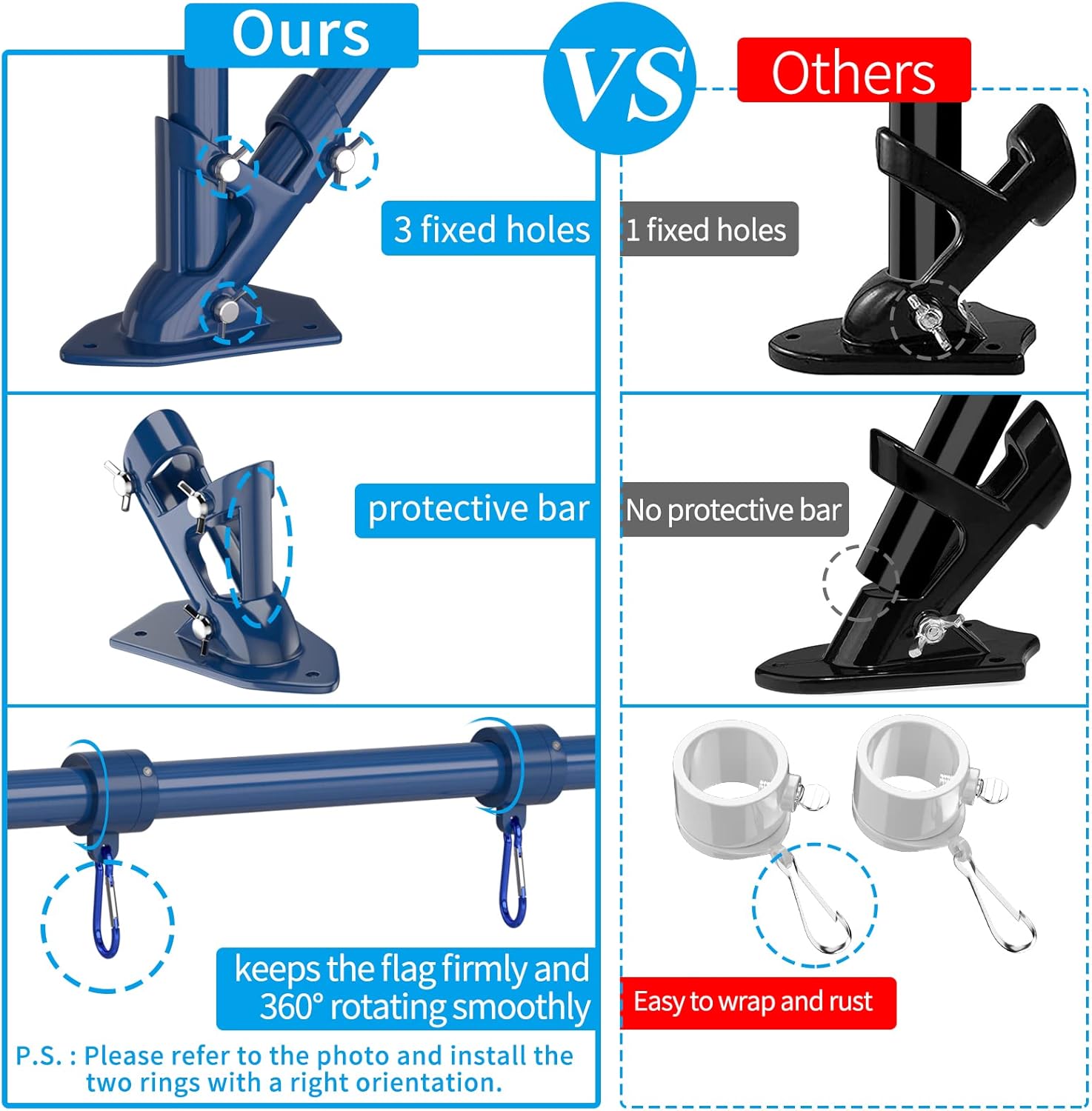 - 🇺🇲Upgraded Bracket and Tangle Free Rings: The high strength aluminum alloy flag pole holder has unique protective bar and 3 fixed holes to make the two-position (90° and 45°) flag pole more stable. The two new designed flag rings and two sturdy carabiners, which could make the flag tangle-free in the wind. And Adjustable length swivel flag pole kit can be installed according to the different size flags.