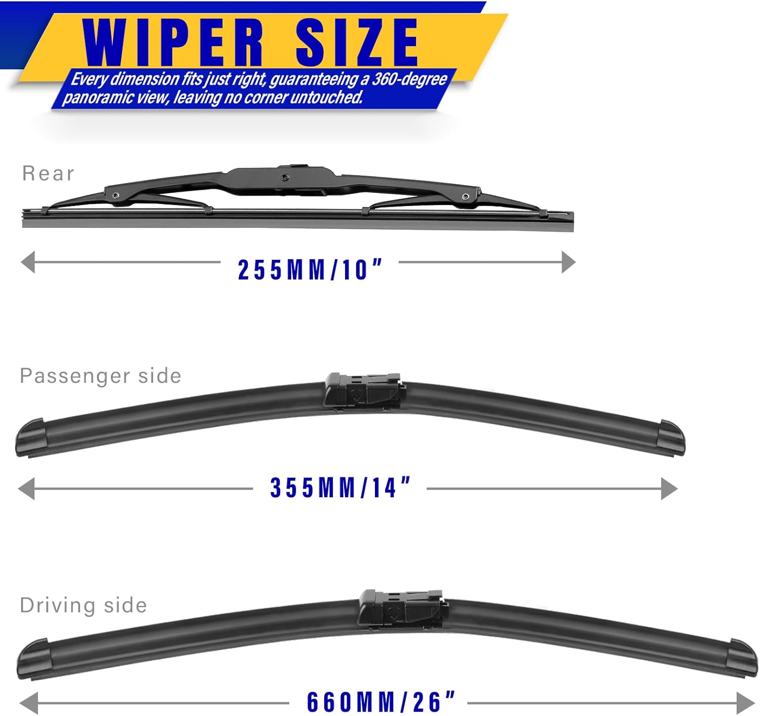 - ăWORRY-FREE SHOPPINGă 3Pcs wiper blades 26"+14"+10" and Instruction Manual. One Year warranty! Refund or return anytime in one year, Long life, smooth engagement.