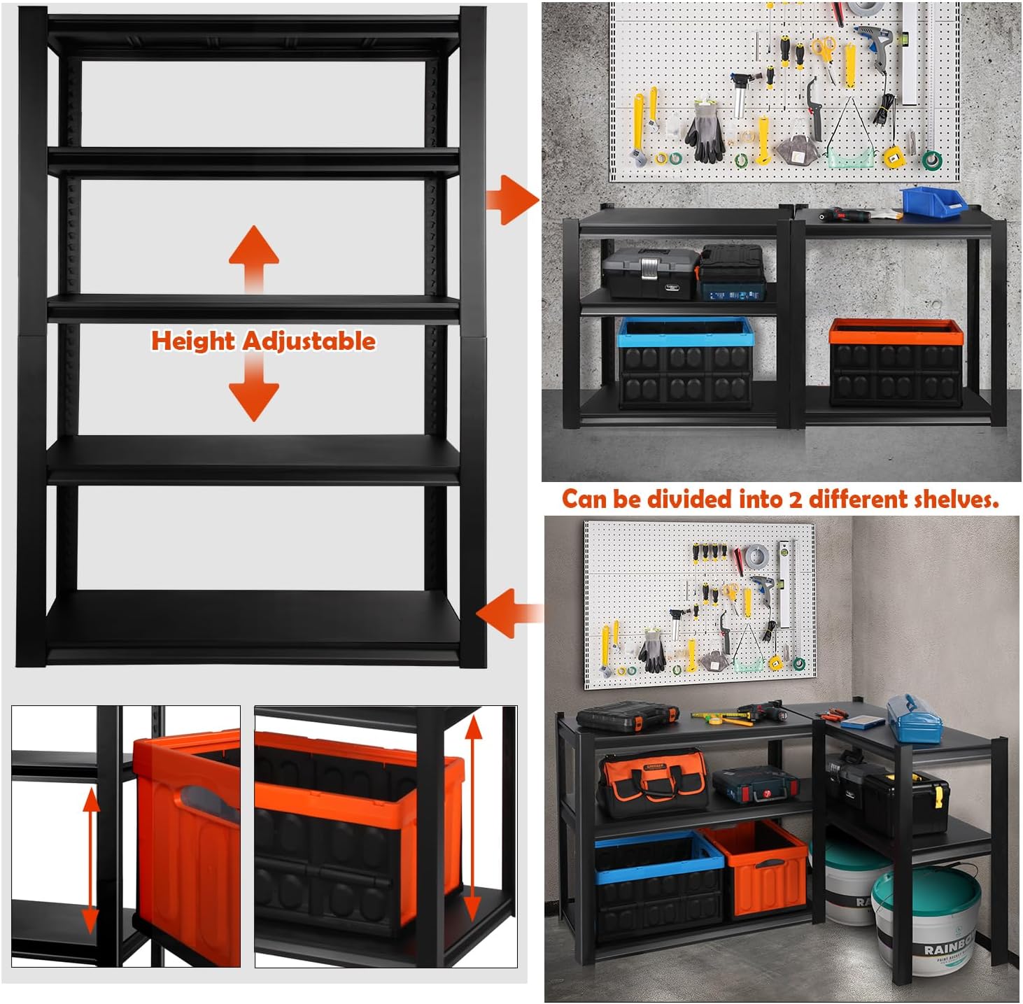 - ADJUSTABLE SHELVES: With adaptable partitions, effortlessly tailor the storage space to accommodate various items, from tools and supplies to household essentials. And it also can be divided into 2 different shelves, which provides more flexibility and meets your DIY needs at the same time.