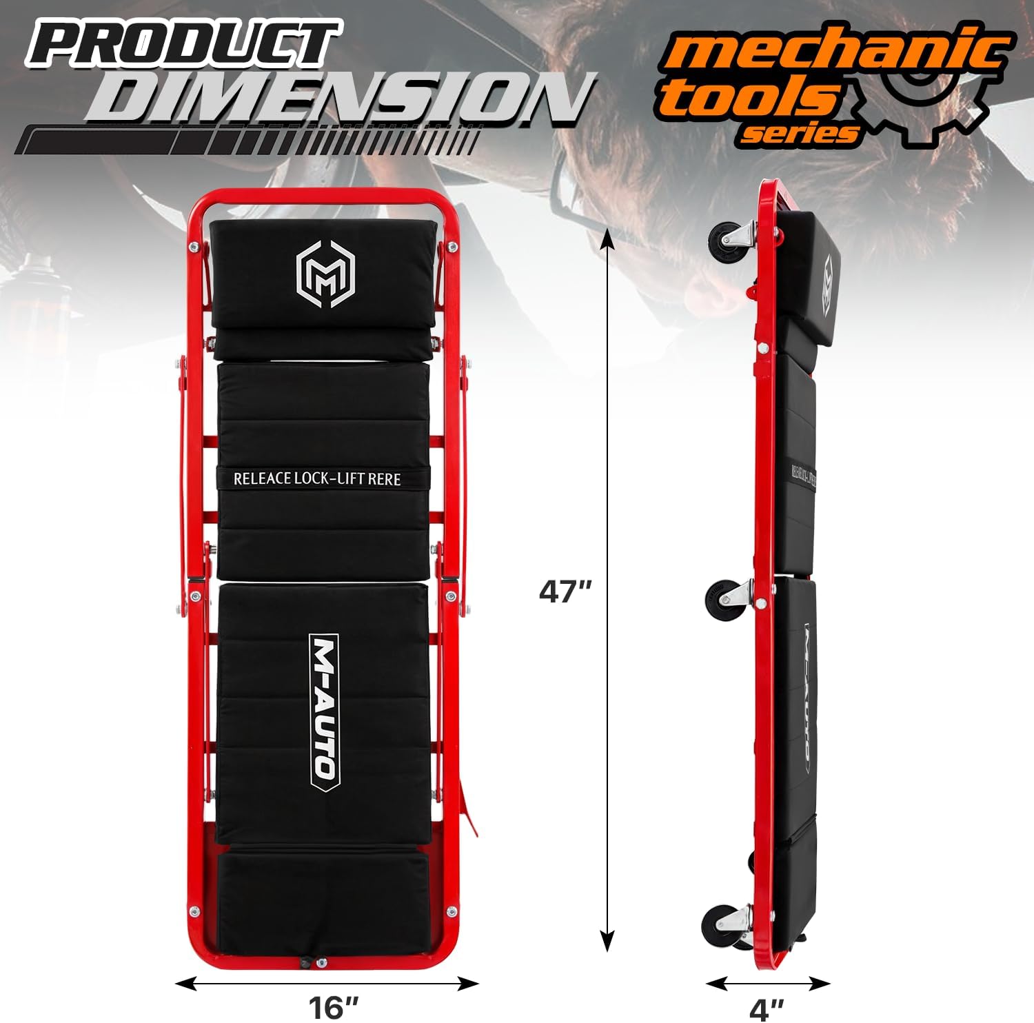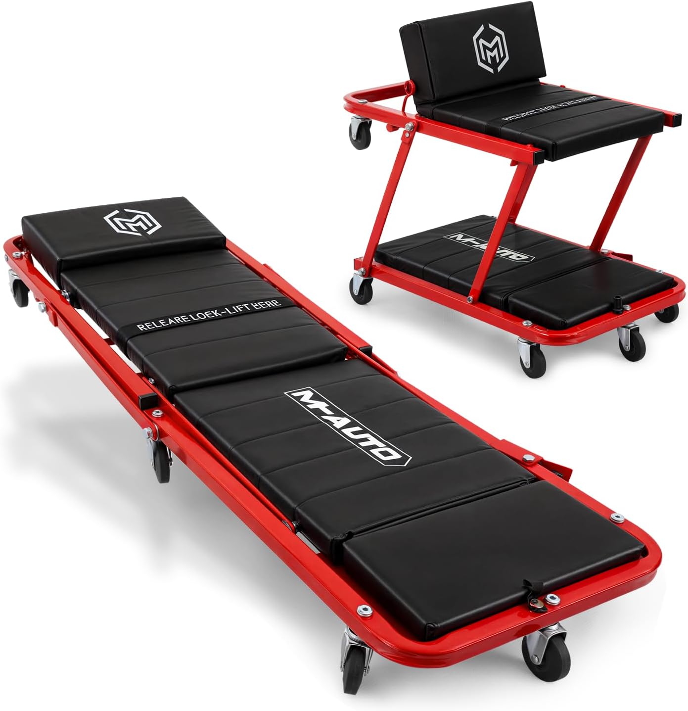 M-AUTO Heavy-Duty Convertible Mechanic Creeper, Z-Creeper 2-in-1 Creeper and Seat 48" Padded Adjustable Headrest Roller Garage Chair with 7 Swivel Casters for Washing, Detailing, Maintenance, Red