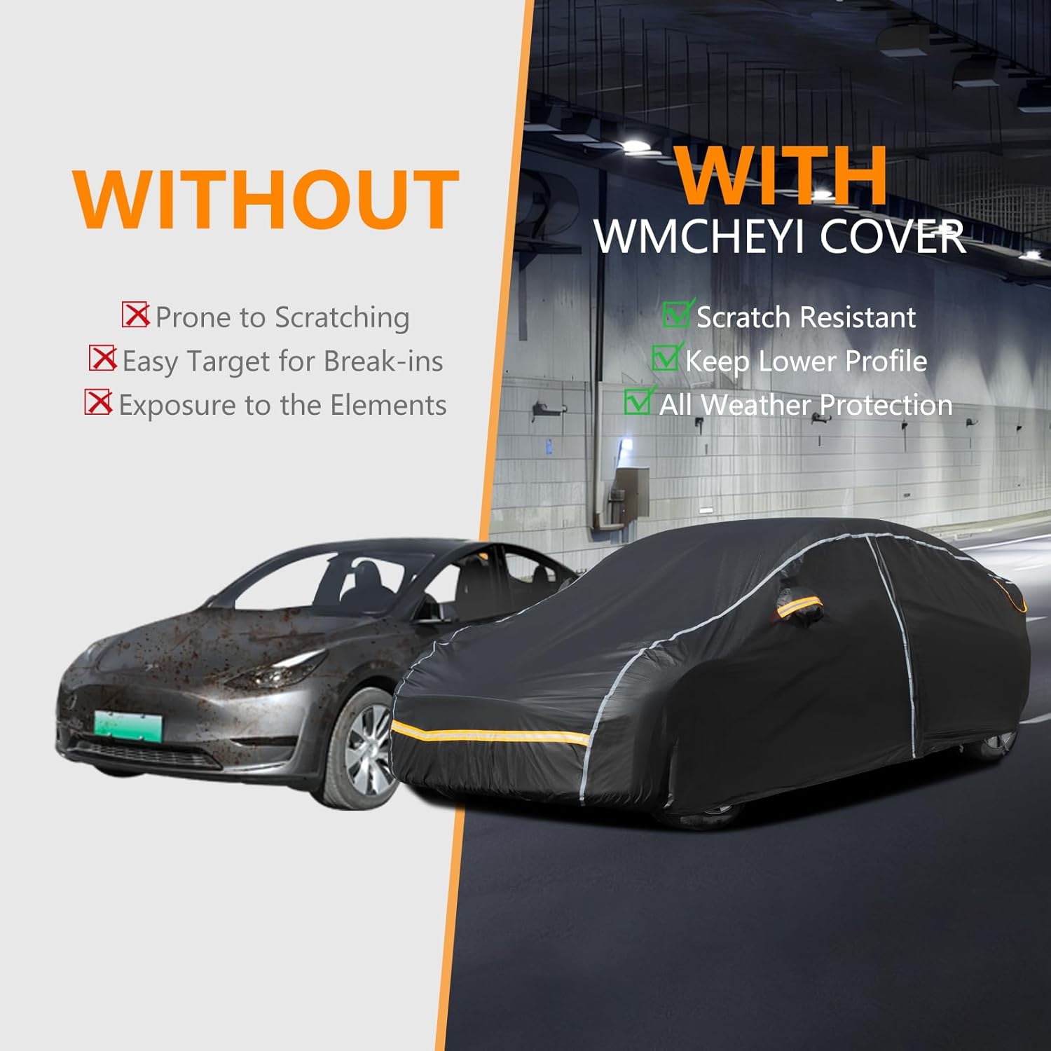 - Premium Material: WMCHEYI car cover is made of 6 layers heavy-duty premium quality material, including non-woven fabric, PE, EVA, and soft lining. Features breathable, durable, and water resistant with a dual outer shell that provides UV protection. And the reinforced seams breathability - Front and rear elastic hems drawstrings - to ensure fit