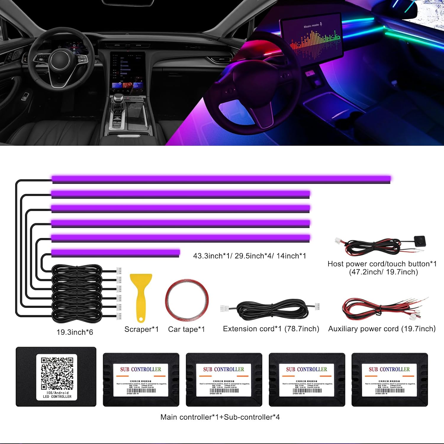 - ăHigh Bright & UniformăThe RGB Acrylic Ambient Light Strip have super bright LED and acrylic lens and contains 6 LED strips (4*29.5inch+1*43.3inch+1*14inch) , also comes with 1 main controller and 4 sub controllers,and can be flexibly installed on any car by DIY without disorganized, which is plug and play, and and this acrylic light evenly spread over the lamp strip is brighter, more uniform and softer than other optical fiber lamps that rely on only one LED.