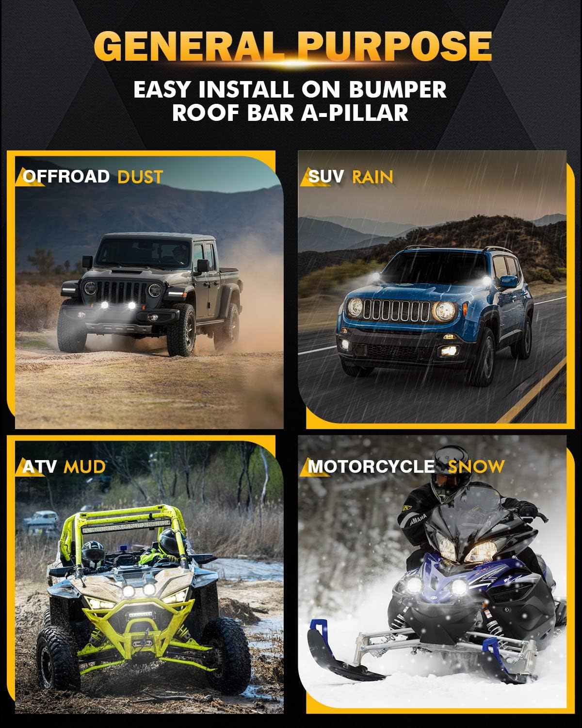 - [50,000+ HOURS LIFESPAN DURABILITY] - Led off road lights are made of thickened 6063 diecasting aluminum heat sinks, which maximizes surface area for optimal cooling and enhances the led pod lights' lifespan to over 50,000 hours. 90Β° adjustable stainless steel mounting brackets make it easy to change your lighting direction.