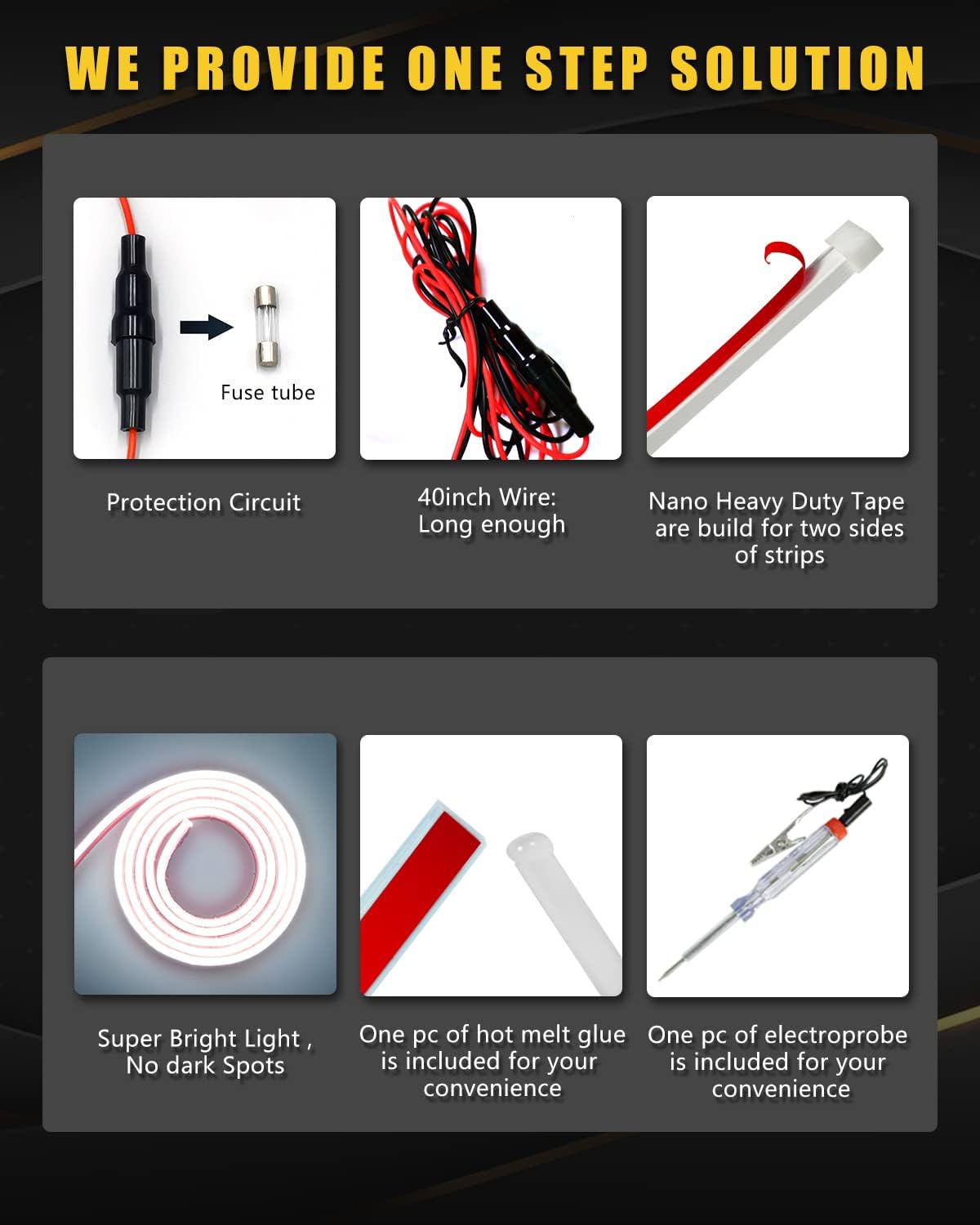 - Special Feature : Package includes one test pencil,one hot melt glue stick., Soft & Bright Light ,No Dark Spots, Two sides of Strip are Build with heavy duty Nano Tape, With 40 inches wire, With fuse tube for protection circuit Package includes one test pencil,one hot melt glue stick., Soft & Bright Light ,No Dark Spots, Two sides of Strip are Build with heavy duty Nano Tape, With 40 inches wire, With fuse t⊠See more