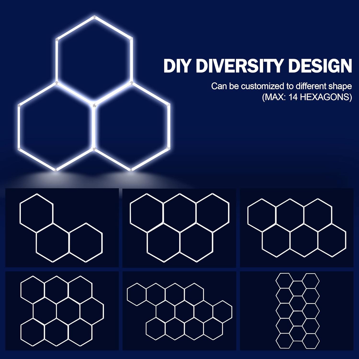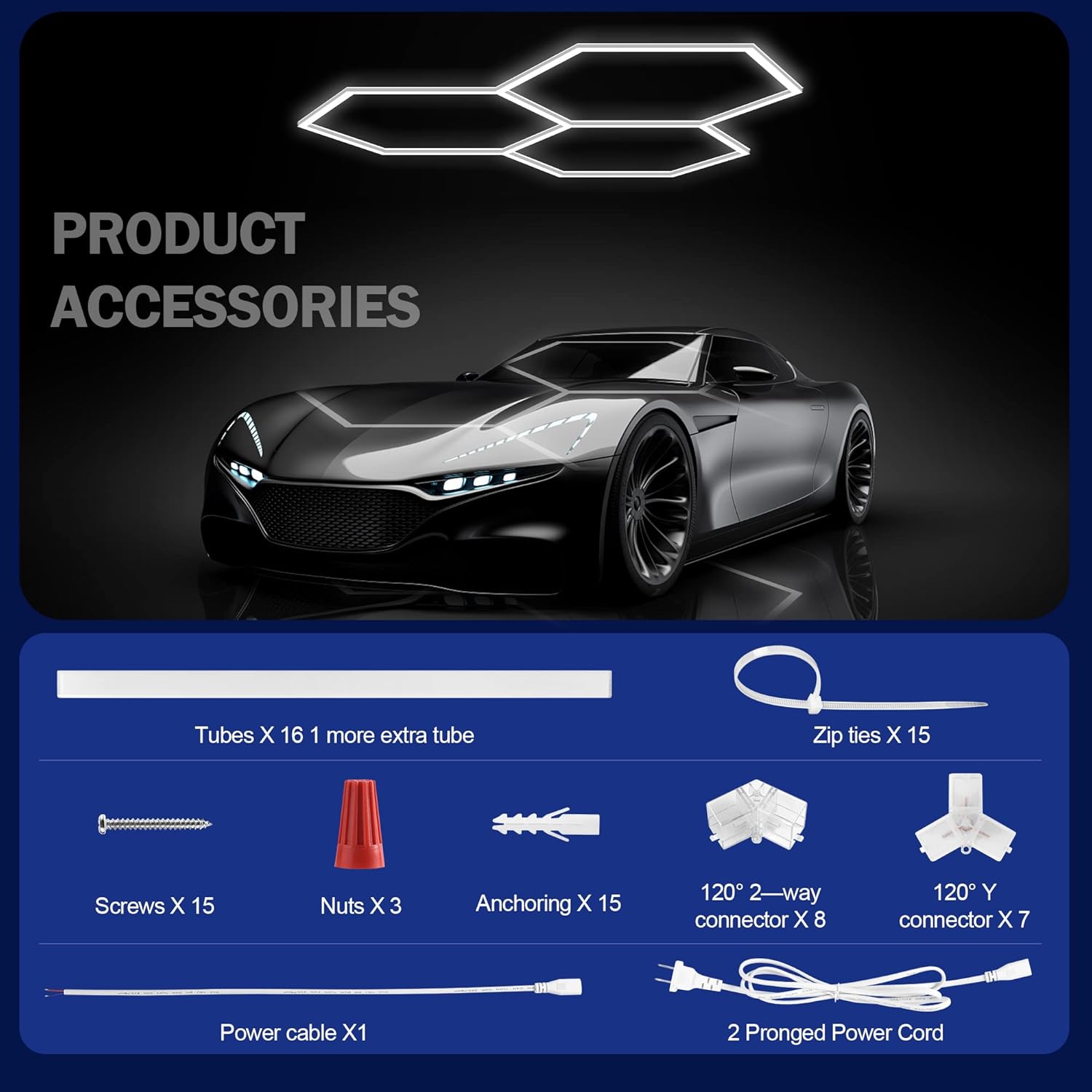 - 【More Accessories】 The whole set of car hexagon garage light contains light tubes and accessories, tubes including 16pcs 0.44m(17.32inch) to make the hexagon grid system and 1pcs extra light tubes for replacement if needed; 8pcs V connectors, 6pcs Y connectors, 15pcs anchorings, 15pcs screws, 15pcs zip ties, 3pcs nuts and 1pcs power cord with plug.