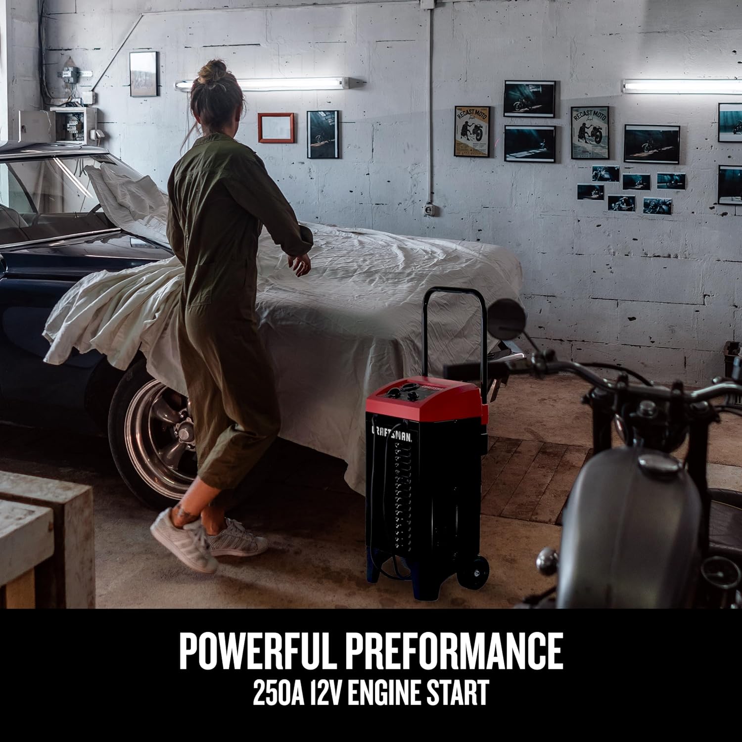CRAFTSMAN Wheeled Battery Charger and Engine Starter, CMXCESM233, 2-in-1 Manual Timer Controlled, 250 Cranking Amps, 6 Volt, 12 Volt, for Car, SUV, Truck, and Marine Batteries