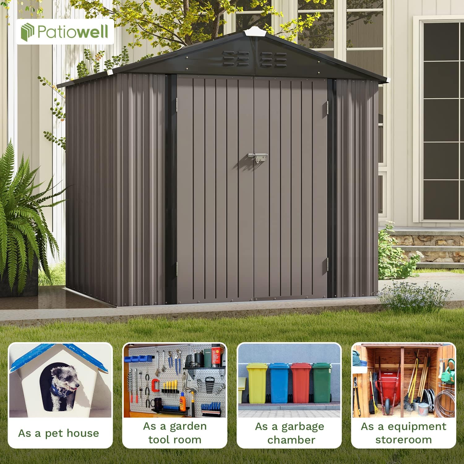 Patiowell 8x6 FT Outdoor Storage Shed, Metal Tool shed & Outdoor Storage with Lockable Doors & Air Vents, for Backyard Garden Patio, Brown