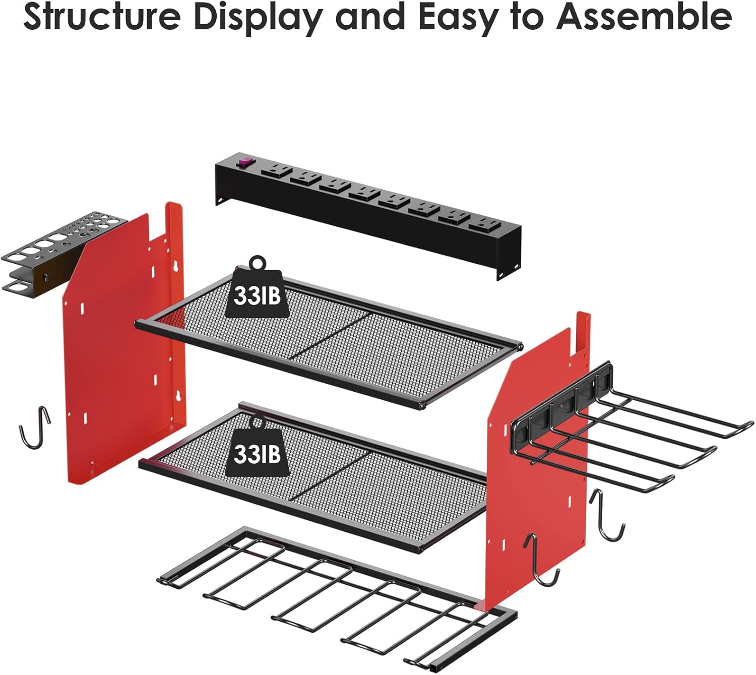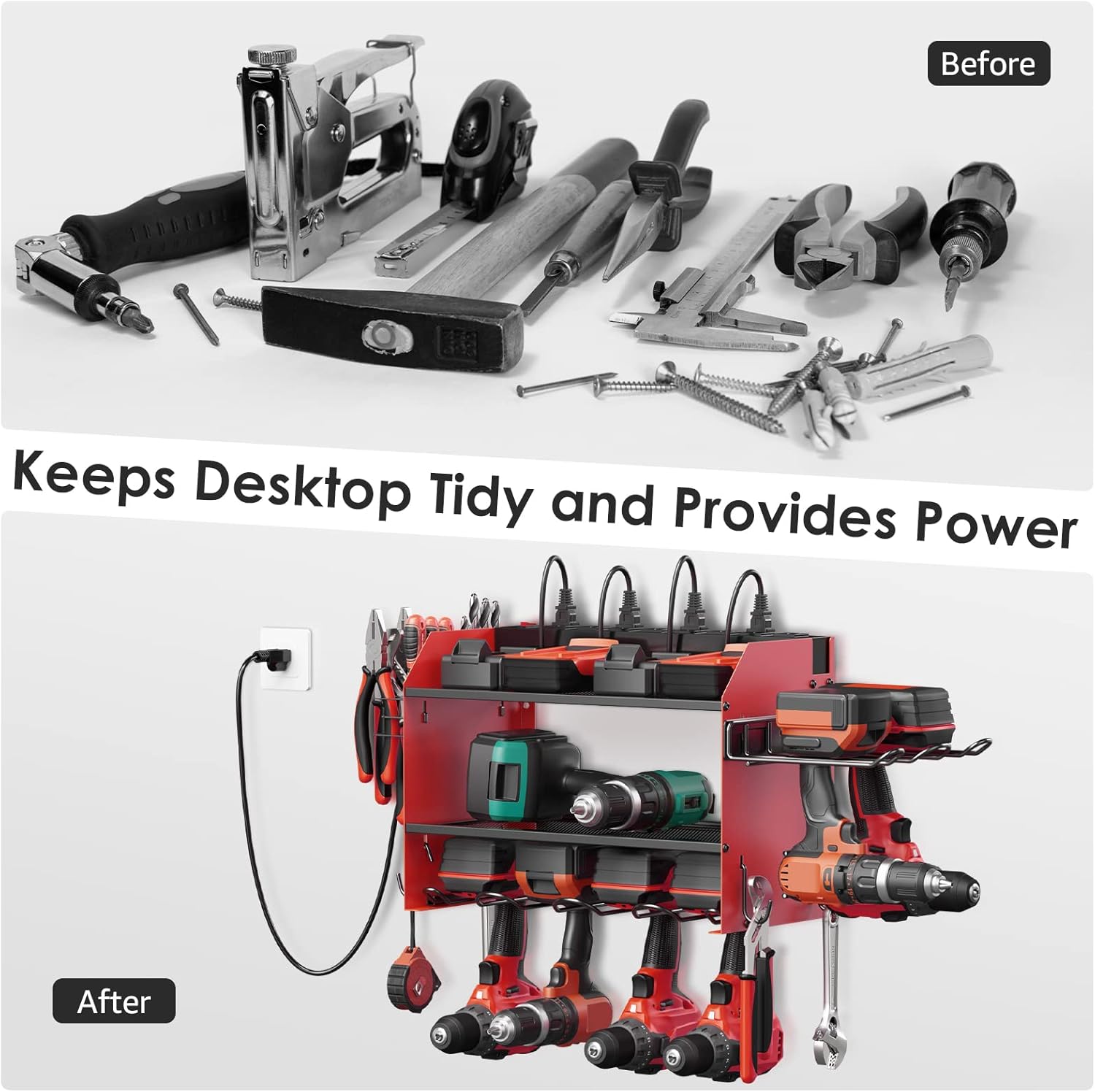 CCCEI Modular Power Tool Organizer Wall Mount Charging Station, Red 6 Drills Holder with 8 Plug Power Strip, Garage Drill Battery Heavy Duty Metal Shelf, Utility Rack with Hooks, Side Storage.