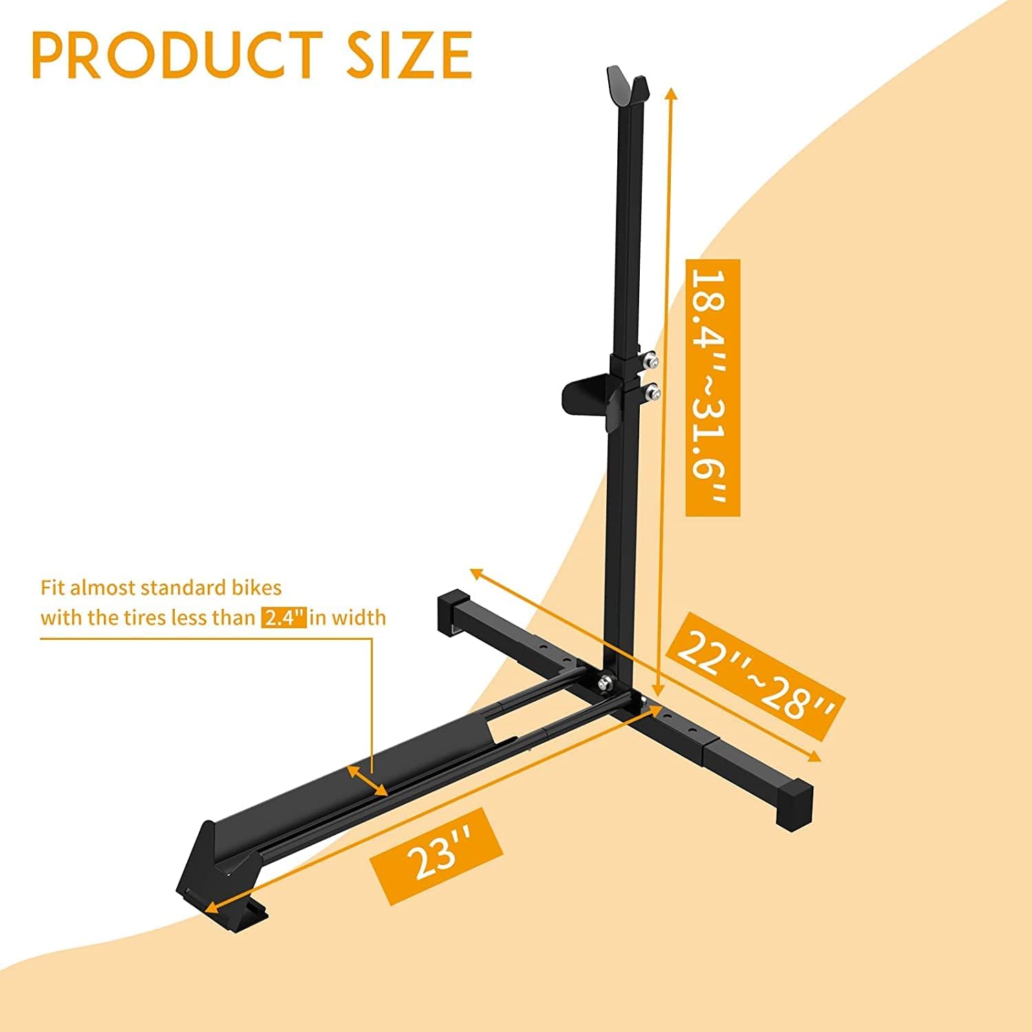 - EASY ASSEMBLY UPRIGHT DESIGN-means no more struggling to lift and hang heavy bikes to make room in your house. Adjusts to various heights, is completely portable, and is fully adjustable