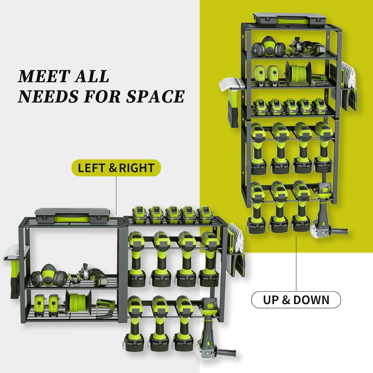 - HIGH CAPACITY: The KAFAHOM power tool organizer has 2 downside racks that can hang up to 8 power tools - 20Vs, 60Vs, and 66Vs. Plus 4 extra upper layers for accessories of those power tools like battery holders, batteries, drill bits, rotary tools, nail units, etc. The tool organization and storage also comes with 9 holes for screwdriver storage οΌ7 for pliers. The entire body is made of cold-rolled carbon steel for excellent durability and a load capacity of over 180 lbs (max).