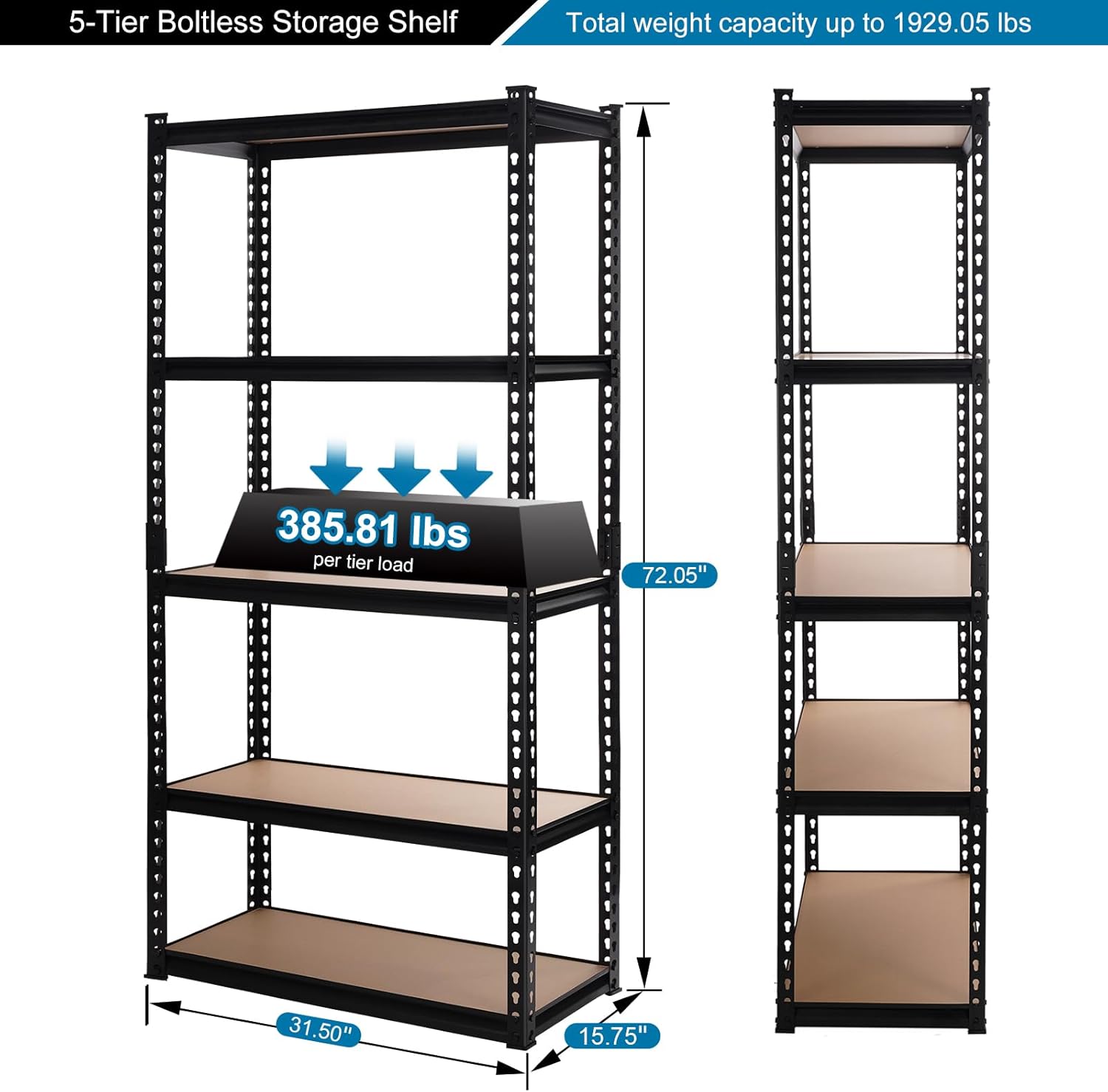 - HEAVY DUTY STORAGE SHELVES: Each shelf can hold up to 385.81lbs, with a total bearing capacity of 1929.05lbs, the heavy duty shelving units are robust and versatile so they are able to be used effectively in a large variety of environments, from offices and utility rooms to garages and workshops. Measures 31.5"Wx15.75"Dx72"H.