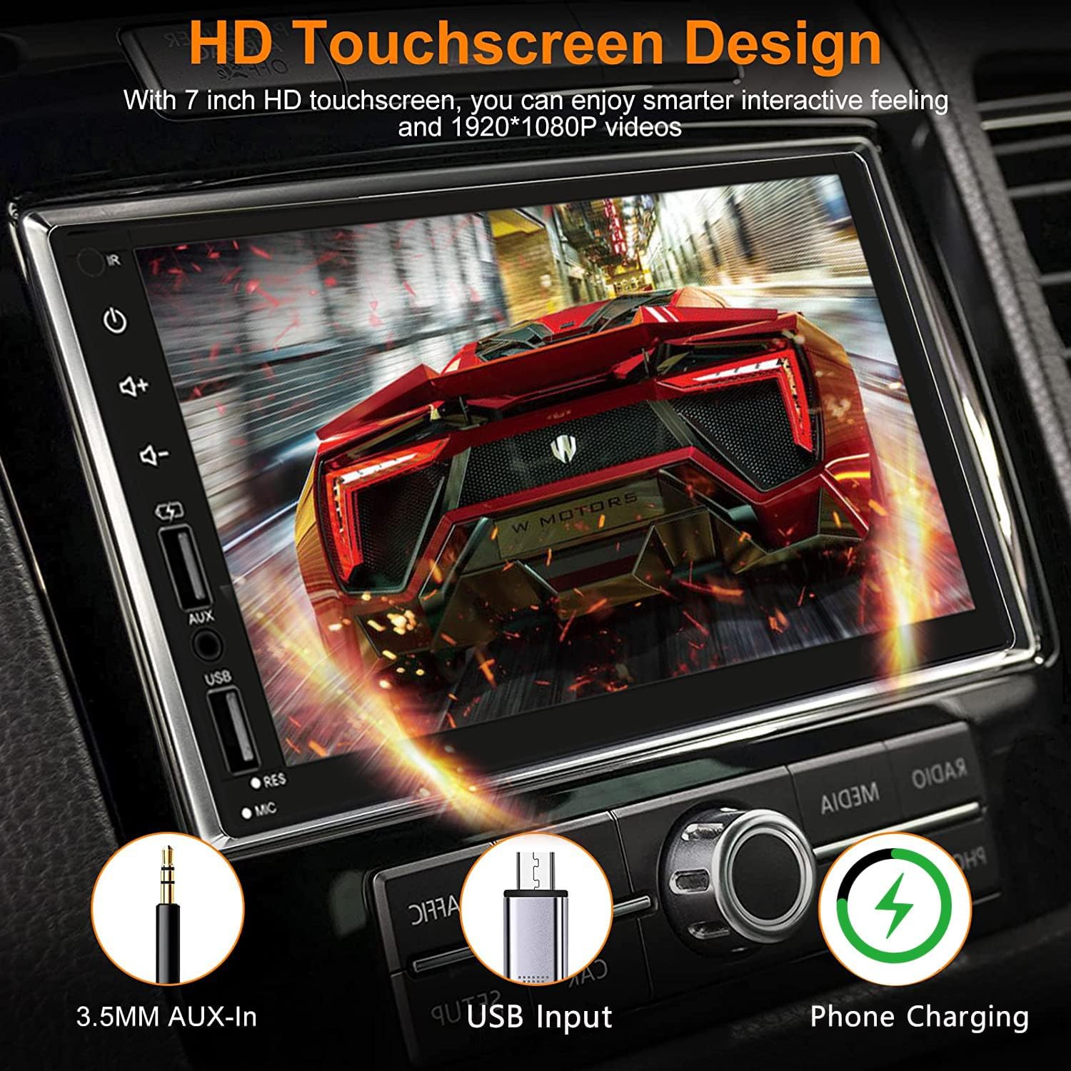 - 🚗【Wired Mirror Link for Phone & HD Full Touchscreen】Connect your smartphone to your device via a USB data cable, easily connect and sync any content(such as video, music, GPS navigation, etc.) to the car MP5 player displayed on a large screen. And bluetooth car radio touchscreen is equipped with 7 inch high definition 1024x600 capacitive touch screen,supports 1920x1080P video playback for more sensitive and accurate operation.
