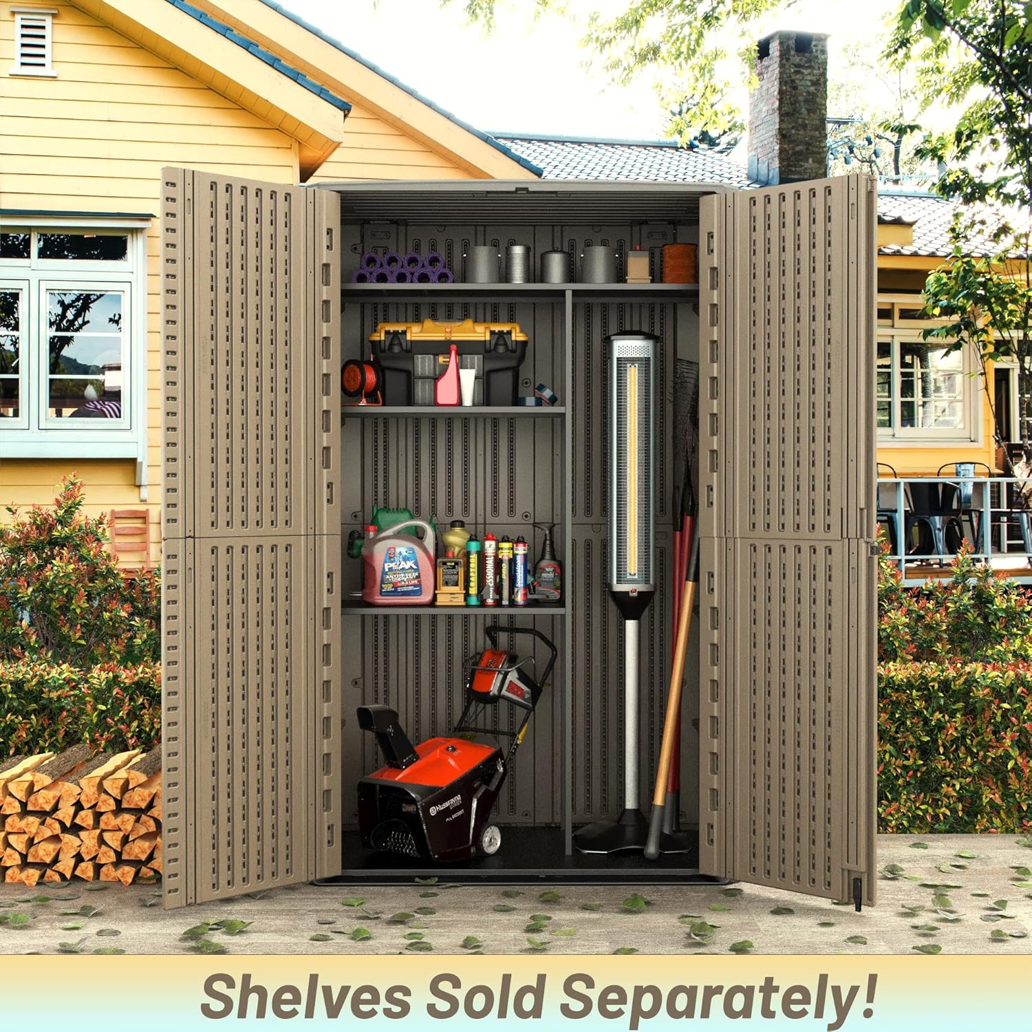 - 【PERFECT FOR STORAGE】 — This vertical lockable storage cabinet could place many kinds of tools, sundries, such as Lawnmower, pool hoses, pool pumps,Resin vertical storage cabinet double-layered ,long handled tools and garden accessories etc.
